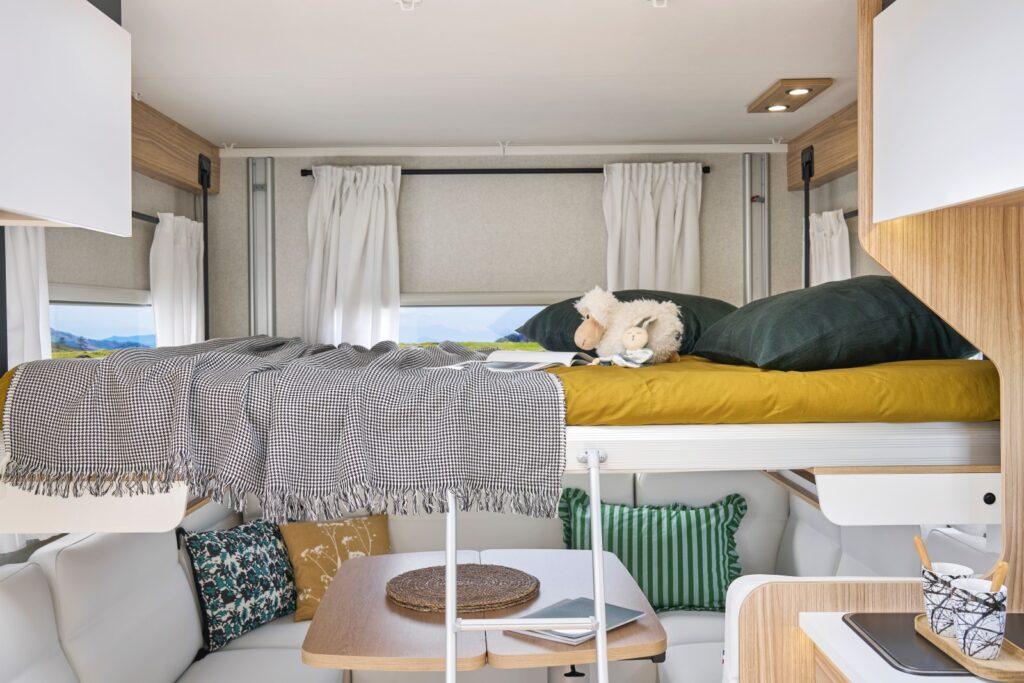 Le salon avec banquettes en forme de U, disposé à l’arrière des camping-cars, c’est l’agencement qui – plus que tout autre – priorise la convivialité à bord. Avec lui, le coin lounge/repas peut accueillir généralement 5 à 6 personnes, tout en offrant une disposition particulièrement cozy. L’idée est séduisante. Tout du moins sur le papier, car elle implique aussi de composer avec un lit escamotable sous pavillon. Autrement dit, il faut faire une croix sur le lit permanent. Pour beaucoup, c’est là où le bât blesse.