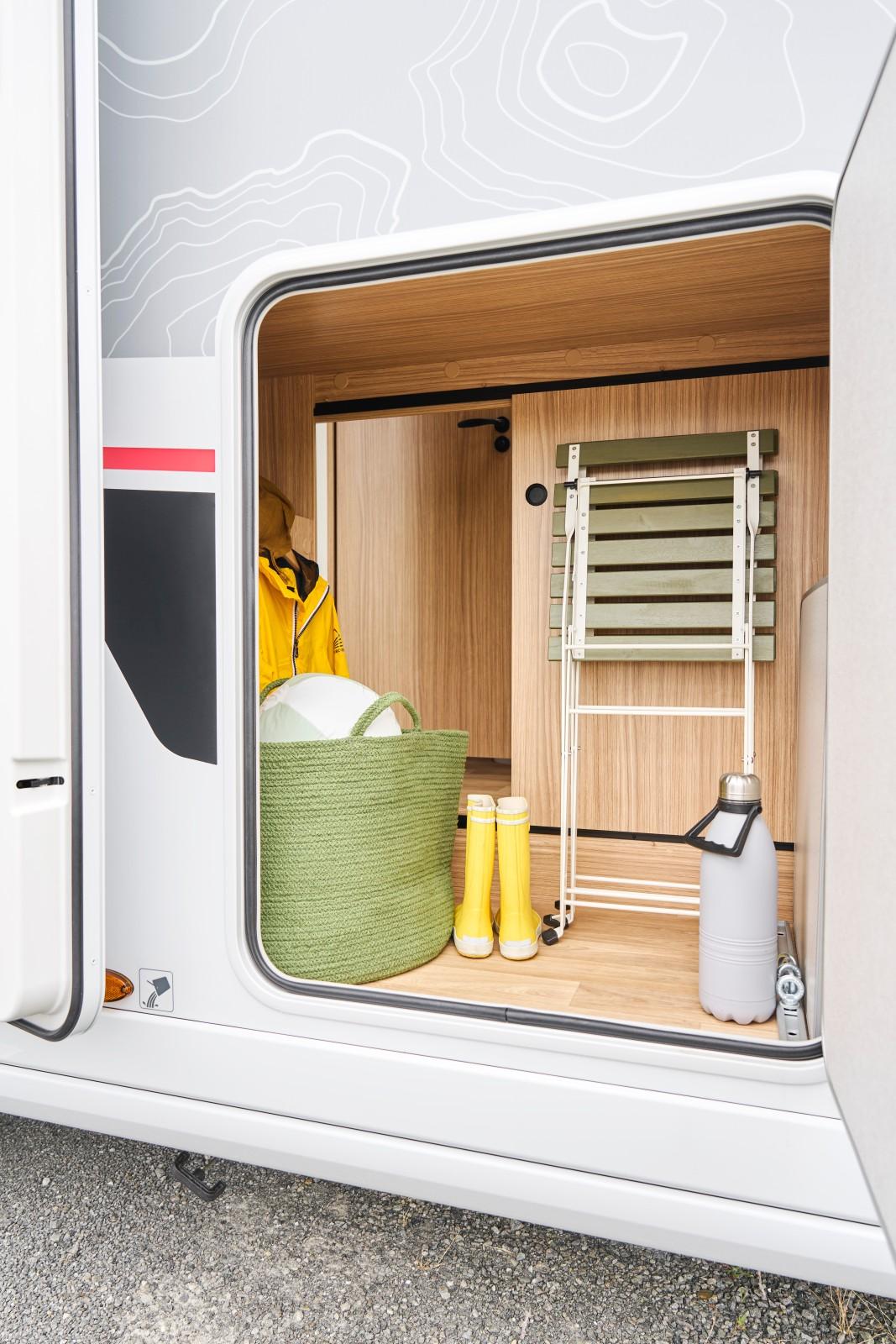 A l’inverse d’autres modèles comme le Rapido 854 F, le modèle P 720 U ne propose pas de soute transversale à l’arrière. A la place, il opte pour un coffre à l’avant droit du véhicule, accessible par deux trappes, intérieure et extérieure. C’est inédit. De par ses dimensions (h x l x p : 110 x 119/143 x 67 cm), impossible d’y mettre un vélo – sinon pliant. Mais cette soute latérale se révèle tout de même bien pratique pour embarquer du matériel de camping.