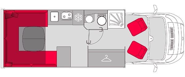 Sans surprise, l’espace se transforme en chambre le soir venu, en abaissant le lit de pavillon à commande électrique. Ce dernier propose une surface de couchage très confortable (200 x 160 cm). Un second lit double, obtenu après manipulations des banquettes, pourra compléter l’offre en couchages. Dans cette configuration, il faudra toutefois se résoudre à ne descendre le lit de pavillon qu’à mi-hauteur.