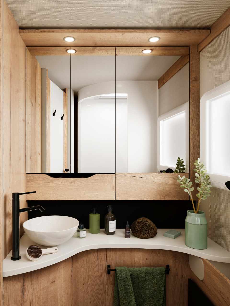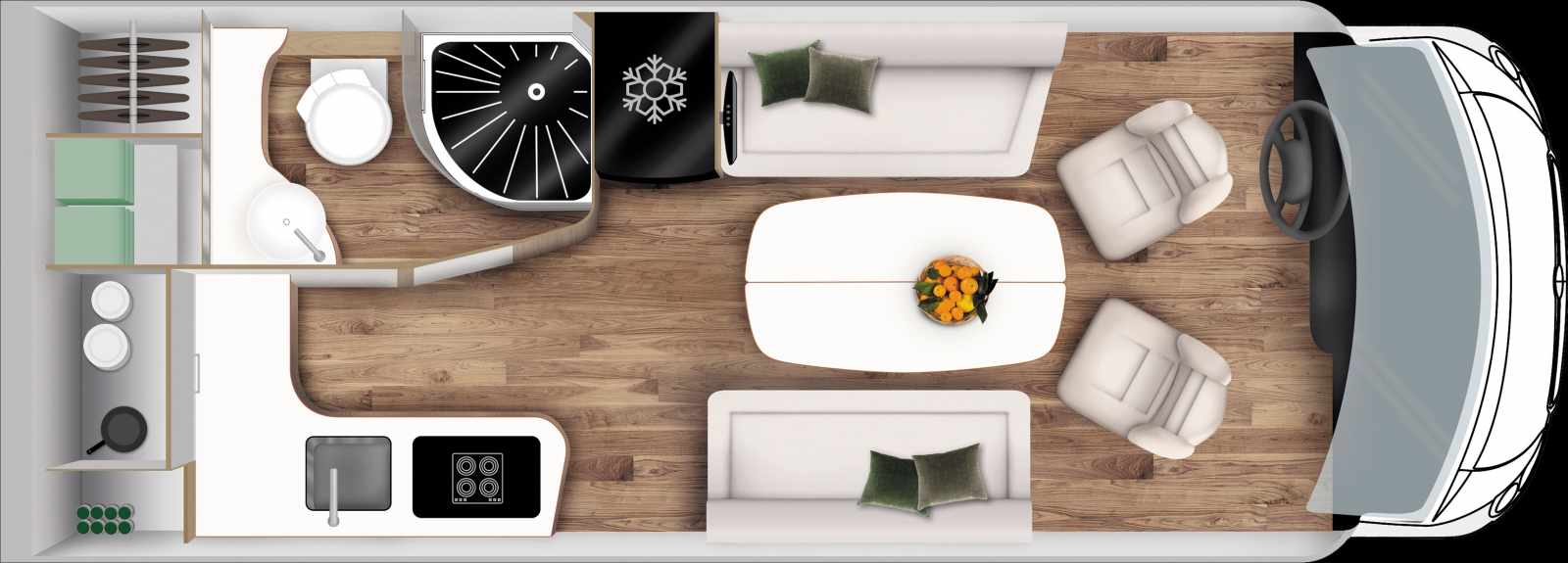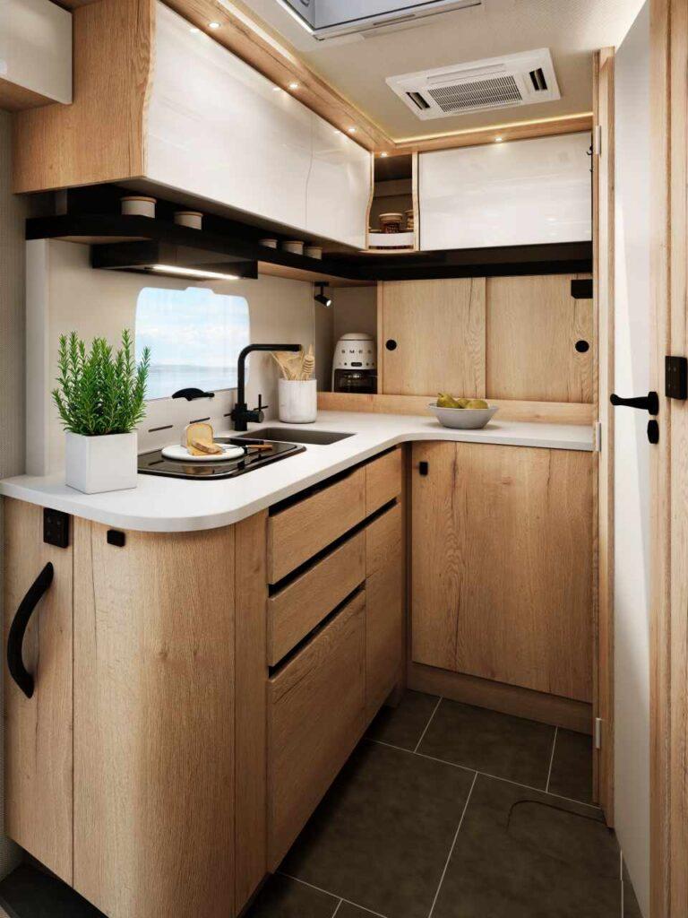 Même sans options, le modèle offre une dotation impressionnante : chauffage Truma Combi 6E (Diesel/230 V), éclairages 100 % LED, hotte aspirante 3 vitesses, grand frigo à compression 175 L, store d’occultation électrique du pare-brise, salon 6 places, finitions contemporaines, éclairage indirect, douche indépendante, WC cassette 17 L, vasque design, etc.