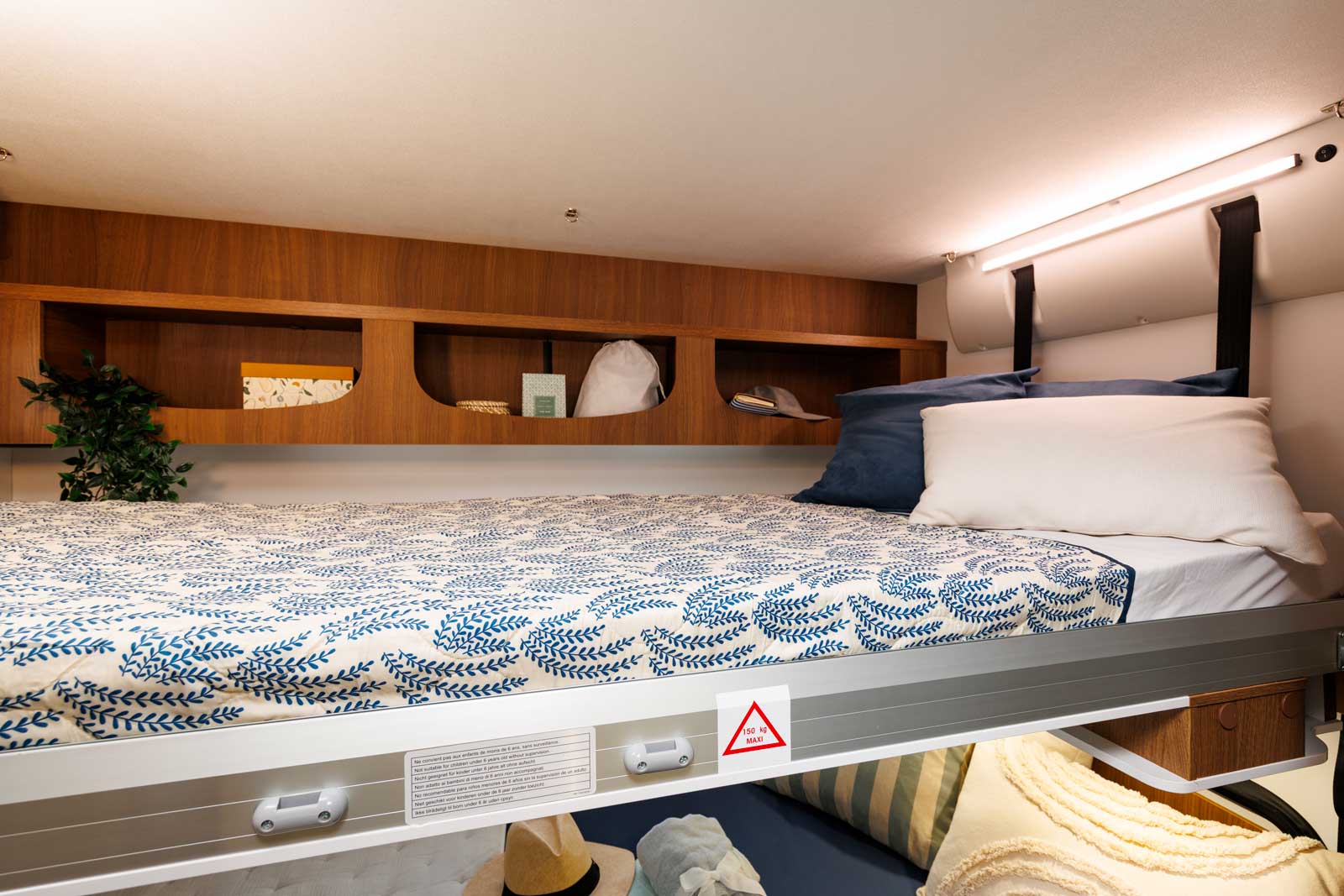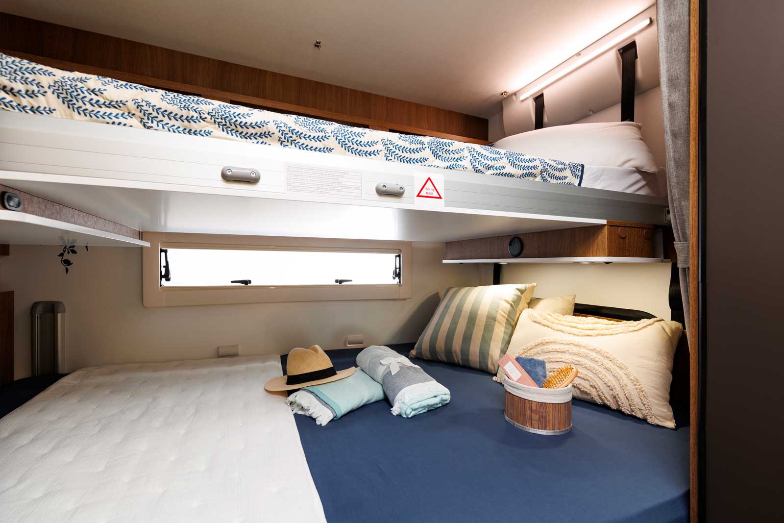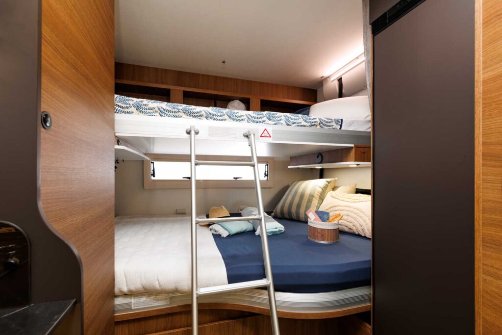 Voyager à cinq, sans avoir à faire et défaire des lits d’appoint au quotidien et à bord d’un camping-car de gabarit très raisonnable de 6,99 m, c’est possible. Pour ce faire, Benimar a développé une chambre arrière avec un lit double transversal en partie basse et un lit simple superposé en partie haute. Chacun de ces lits étant réglable en hauteur. Le lit du haut peut s’effacer en allant se loger contre le plafond, laissant toute latitude pour remonter le lit du bas et ainsi porter la hauteur de la soute à 120 cm (contre 67 cm au minimum).