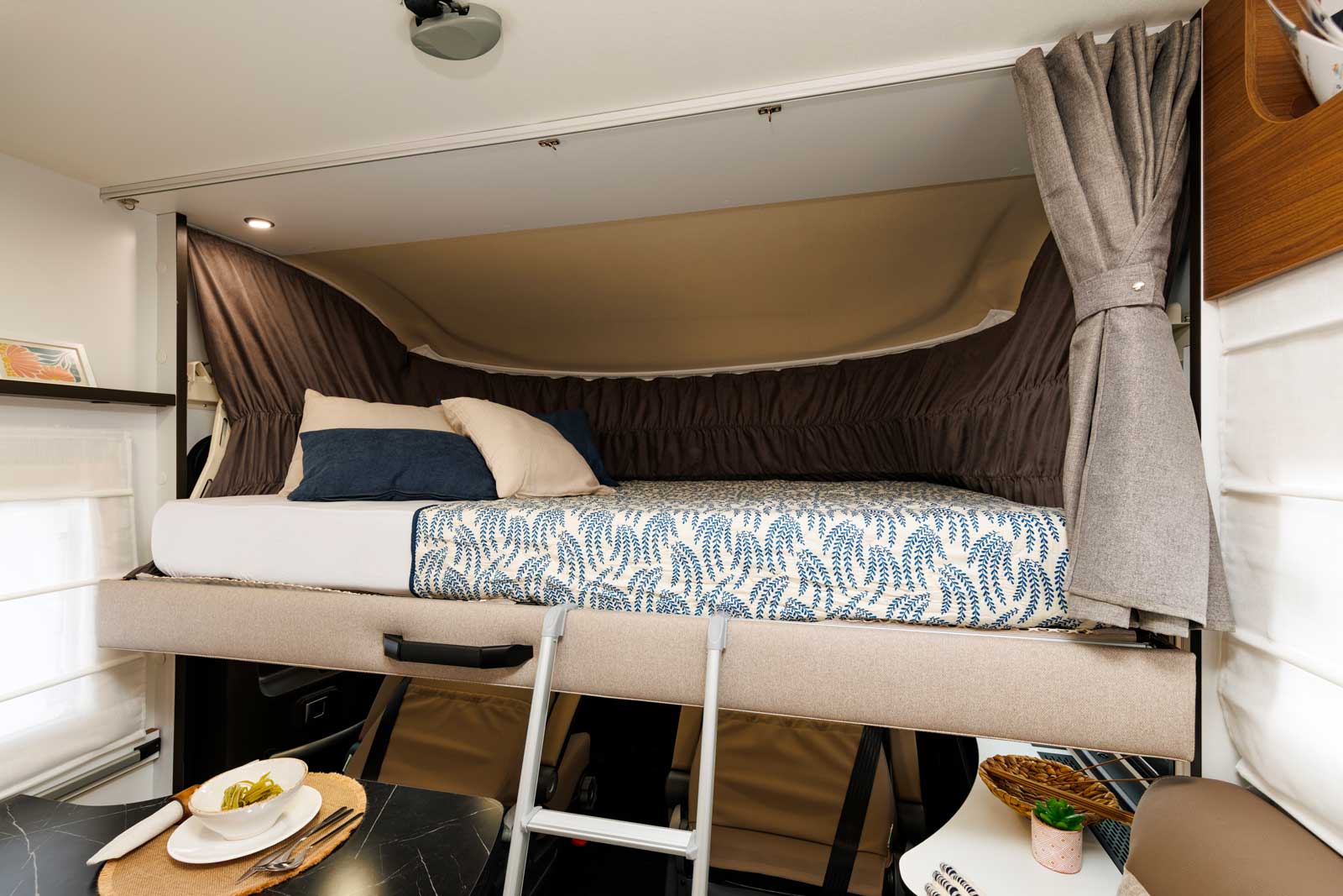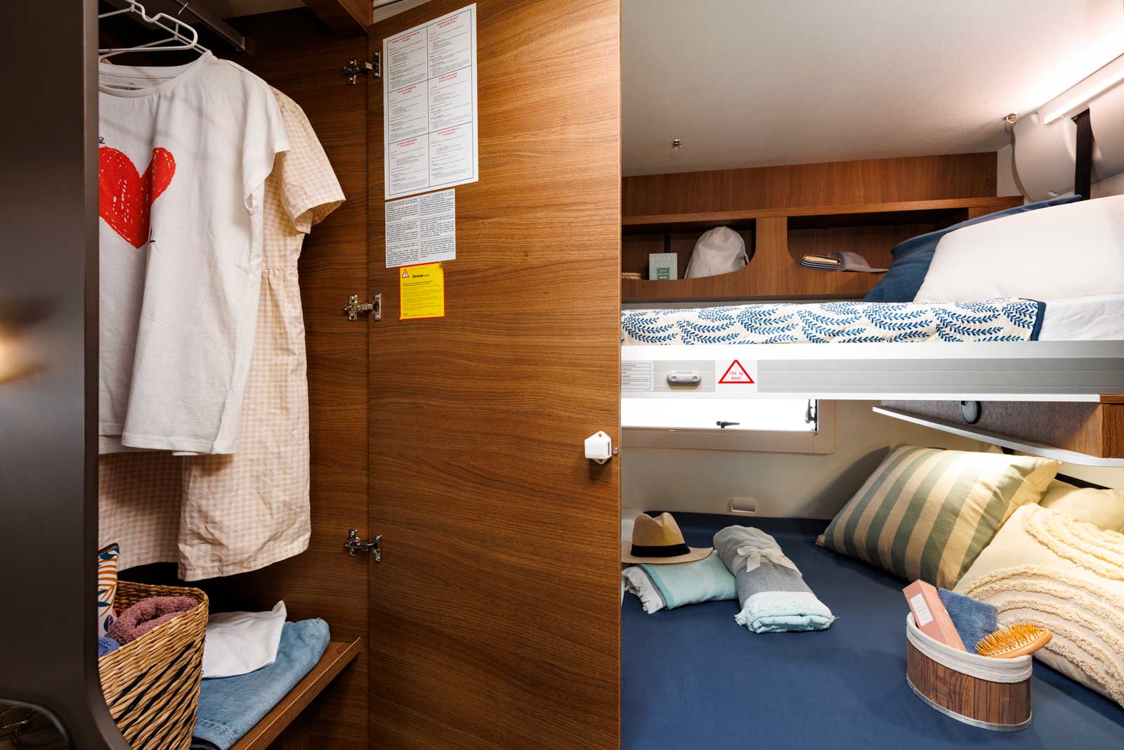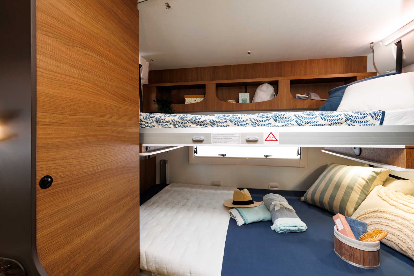 Voyager à cinq, sans avoir à faire et défaire des lits d’appoint au quotidien et à bord d’un camping-car de gabarit très raisonnable de 6,99 m, c’est possible. Pour ce faire, Benimar a développé une chambre arrière avec un lit double transversal en partie basse et un lit simple superposé en partie haute. Chacun de ces lits étant réglable en hauteur. Le lit du haut peut s’effacer en allant se loger contre le plafond, laissant toute latitude pour remonter le lit du bas et ainsi porter la hauteur de la soute à 120 cm (contre 67 cm au minimum).