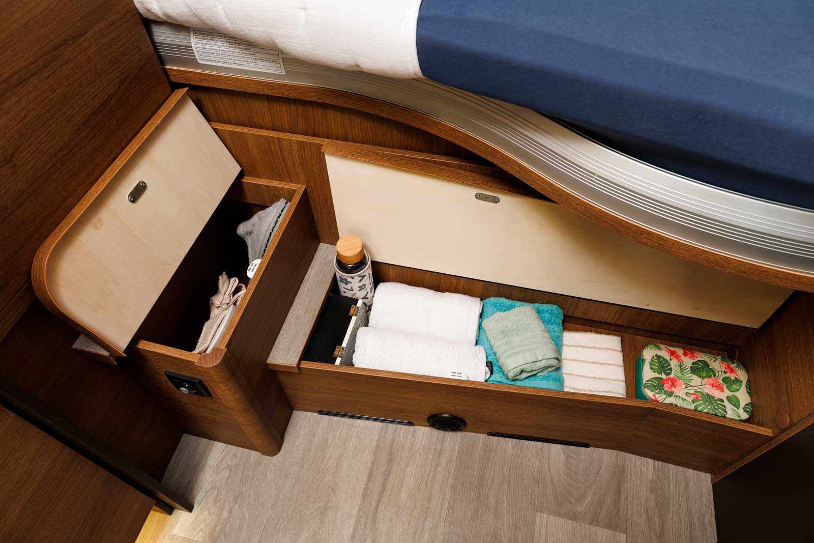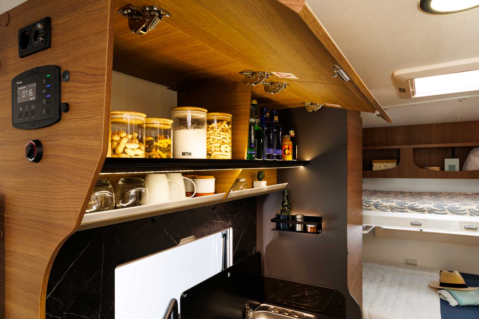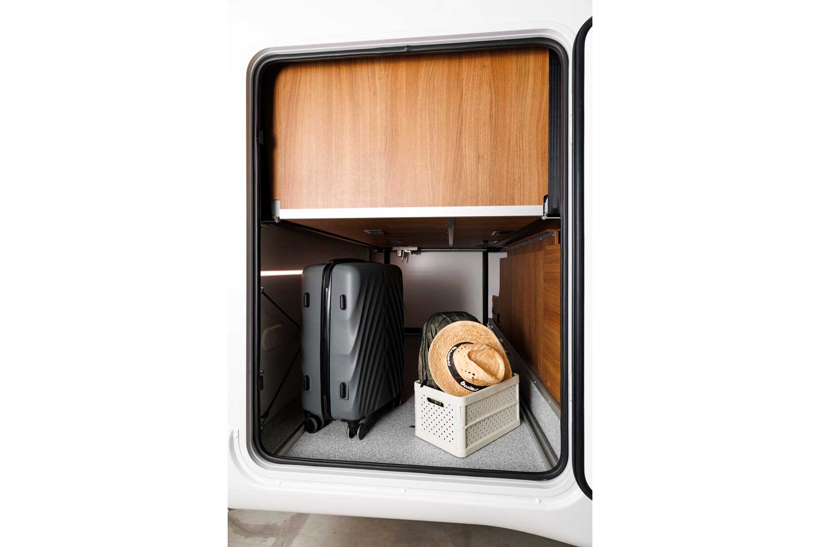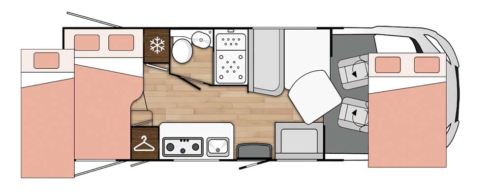 Après tous ses bons points, côté rangement, pas de miracle ! Sous le lit arrière, la soute constitue l’espace de stockage principal (67/120 x 106 x 220 cm). Dans l’habitacle, une grande et haute penderie se loge entre la cuisine et le lit arrière. On compte également un grand placard de pavillon au salon, un coffre sous la cinquième place carte grise et de petits espaces à droite à gauche (marches du lit arrière, etc.). Mais à cinq, on s’en doute, cela impliquera d’être très raisonnable sur la garde-robe. D’autant que la charge utile n’excède pas 475 kg.