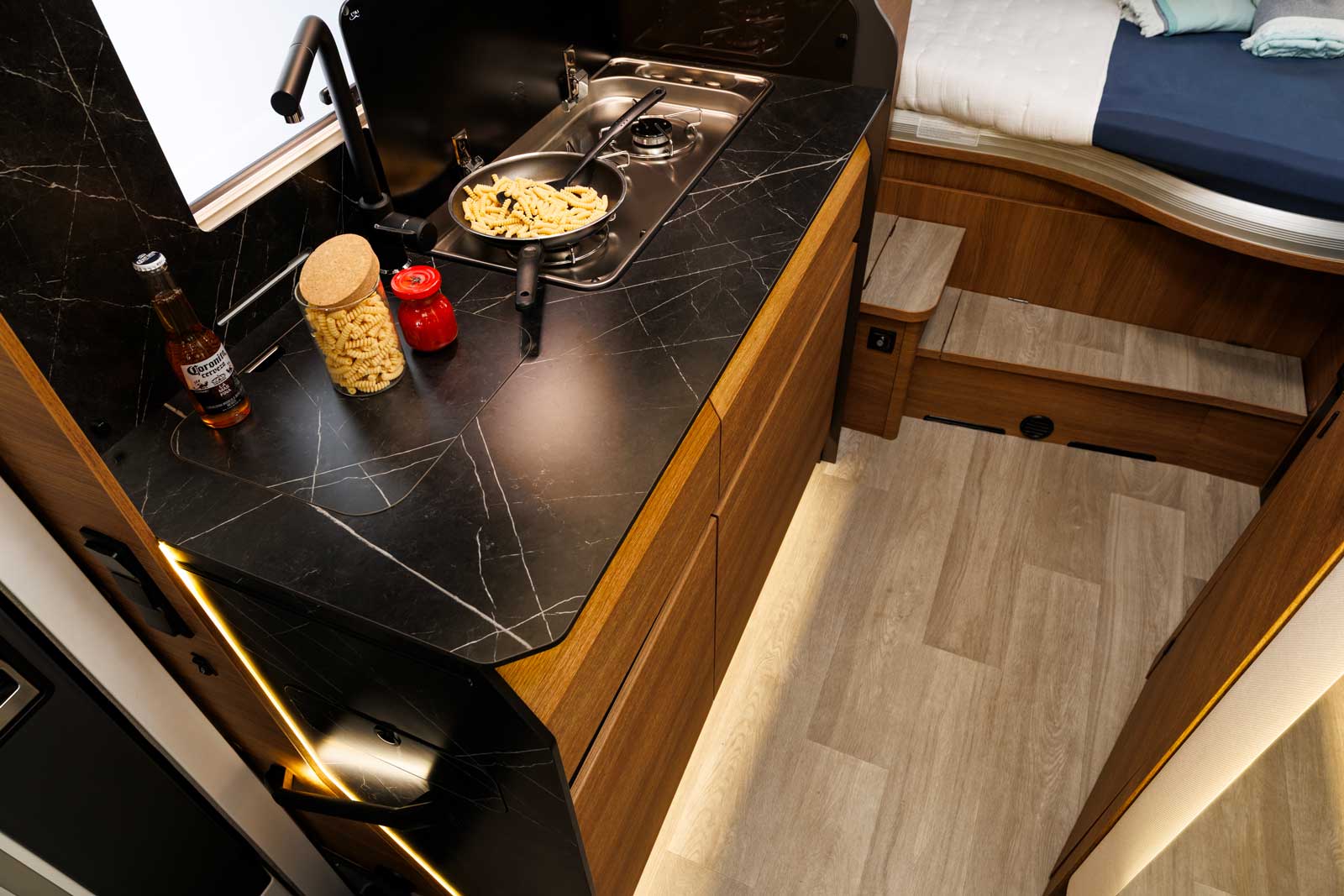 Difficile de faire mieux en cuisine également. Le meuble est imposant (env. 60 x 130 cm) et abrite de grands et profonds tiroir et placards. Lorsque les couvercles de l’évier et du réchaud gaz sont en place, cela représente une belle surface de travail. Quant au frigo de 150 l, c’est pas loin d’être le plus grand volume que l’on puisse trouver à bord d’un camping-car.