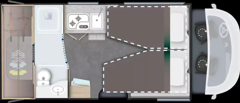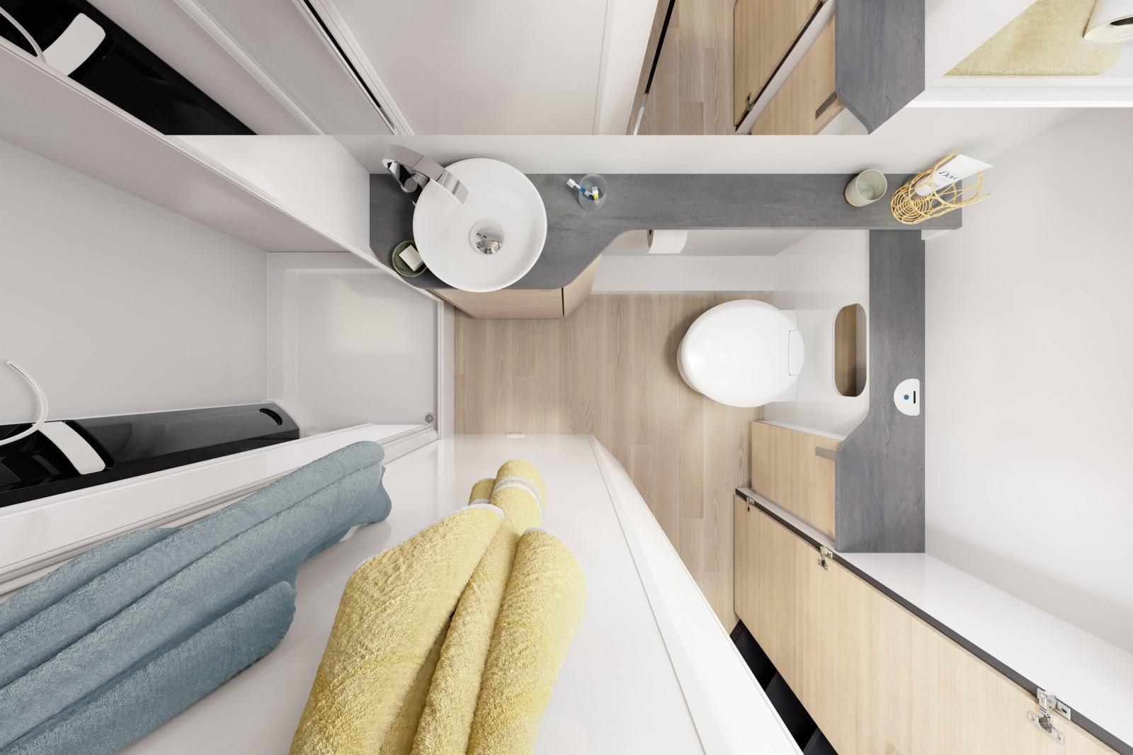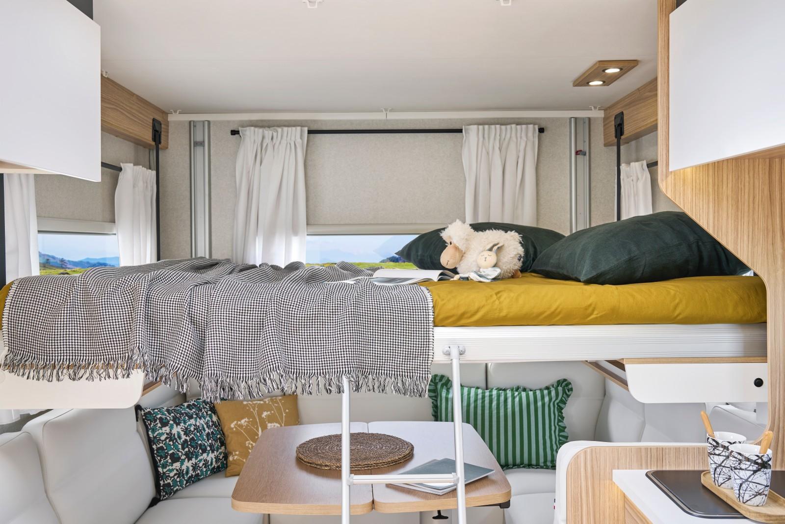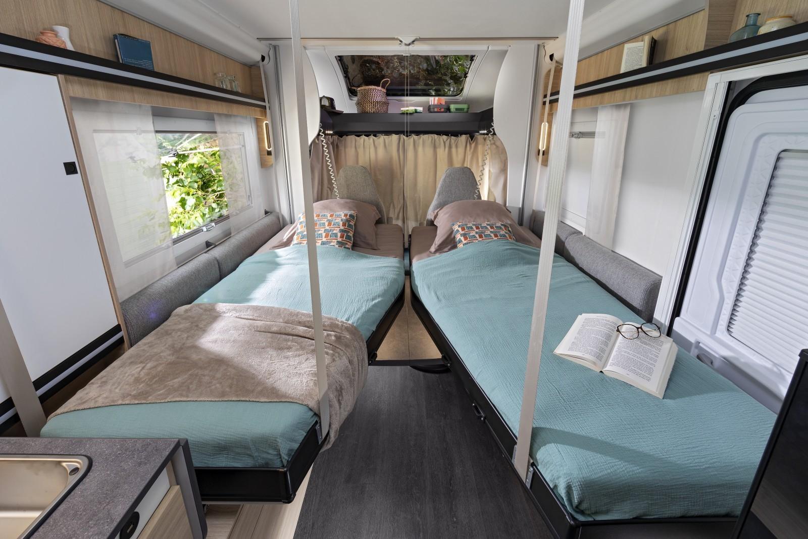 Si en apparence, l’implantation de ce profilé 270 Graphite Edition sur Ford Transit peut sembler conventionnelle (salon avec banquettes face-face à l’avant, salle d’eau avec dressing à l’arrière), elle étrenne de drôles de lits indépendants escamotables électriquement au plafond. Quel est donc l’intérêt de disposer sous pavillon de deux lits indépendants plutôt qu’un seul et grand couchage ? L’atout le plus évident à nos yeux, c’est d’abord l’accessibilité. Contrairement à un lit de pavillon classique, le plus souvent disposé dans la largeur du véhicule, les lits jumeaux préservent un accès central en forme de V, qui facilite les montées et descentes. Chacun est libre de circuler sans déranger son partenaire.