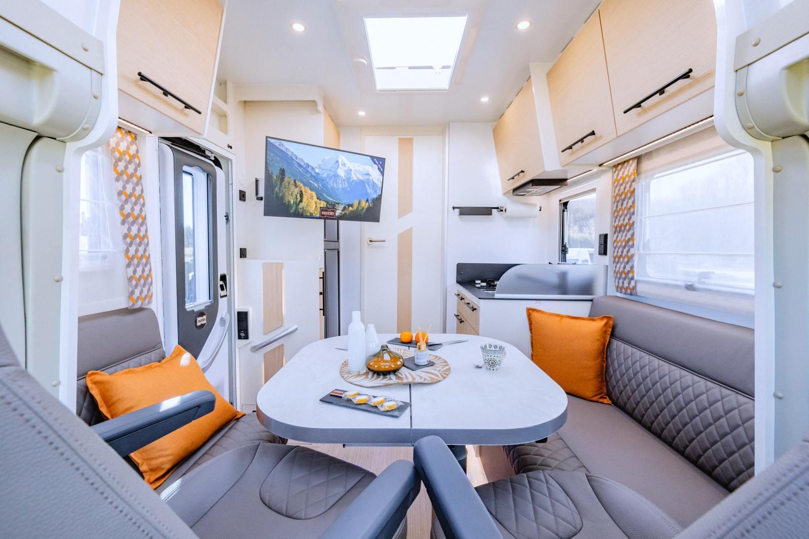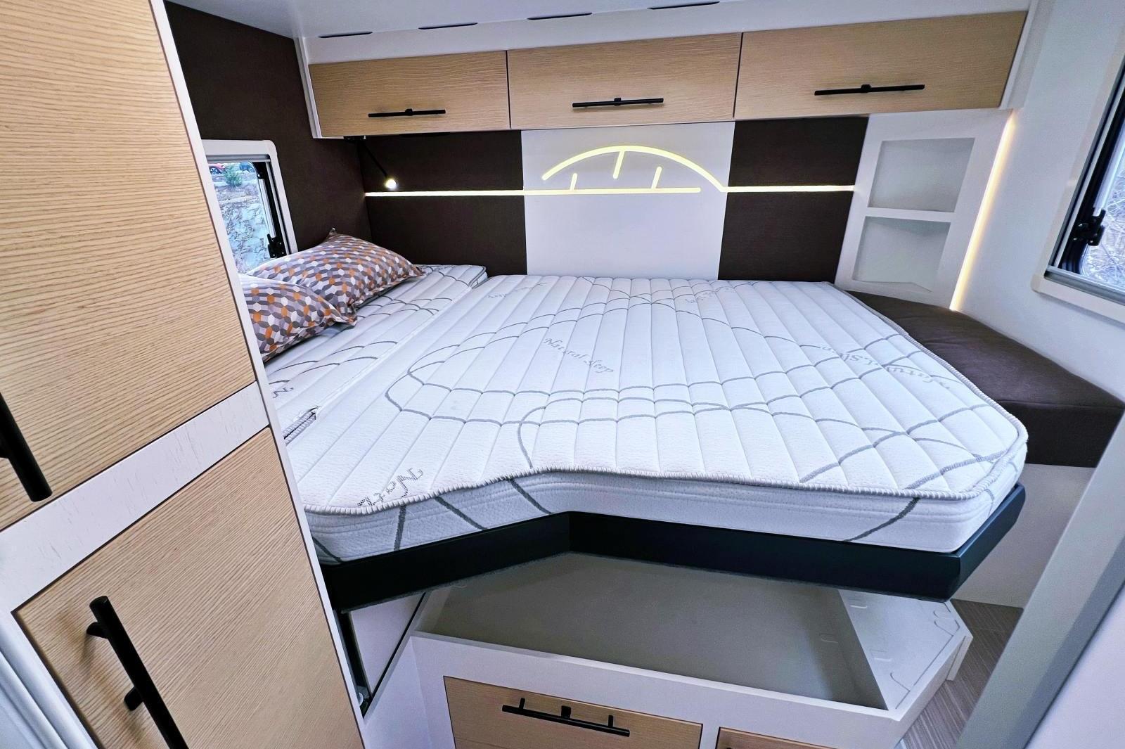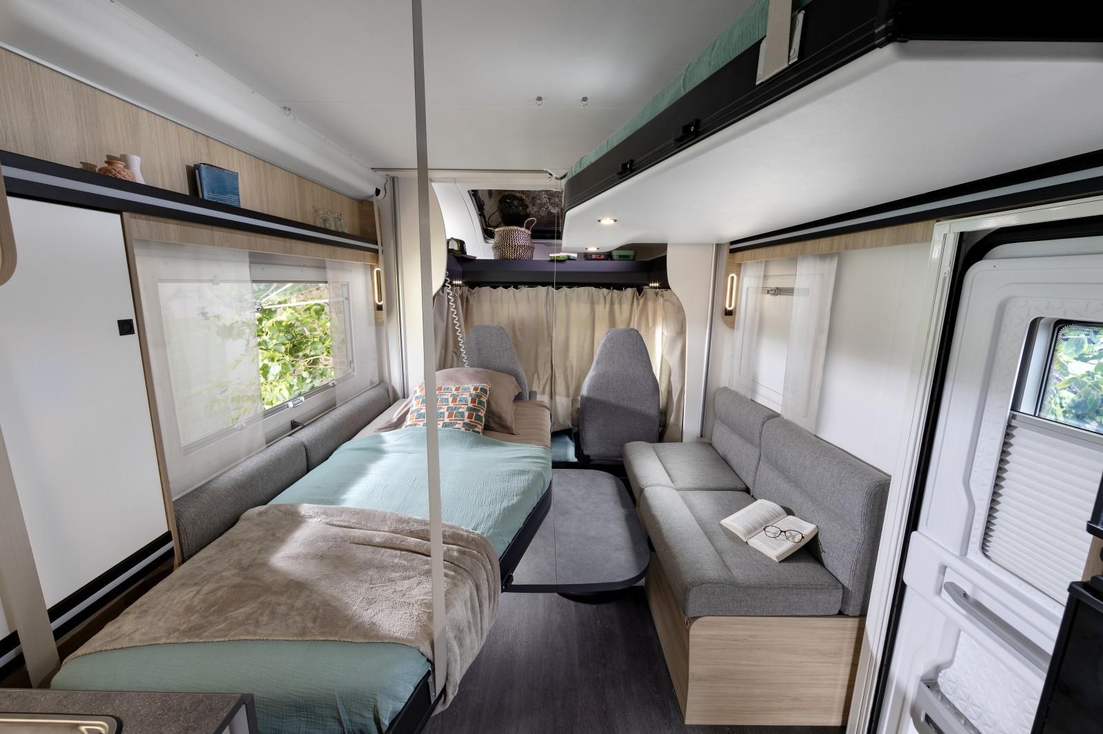 Avec le modèle Héritage 6,9 LF (6,90 m), Le Voyageur renoue avec le petit camping-car de luxe sans lit permanent sur Mercedes Sprinter et châssis AL-KO. Un pari osé ? Attendez de voir le résultat ! En journée, vous profitez de larges volumes aérés, d’une circulation fluide autour des banquettes face-face, de rangements généreux, d’une cuisine en L confortable à l’arrière attenante à la la salle d’eau. La nuit, le lit de pavillon électrique (190 × 200 cm) descend dans la longueur du véhicule. Cette architecture “open space” répond aux attentes de plus en plus fortes d’une clientèle qui recherche de la modularité plutôt qu’un lit fixe souvent disproportionné sur un véhicule court.