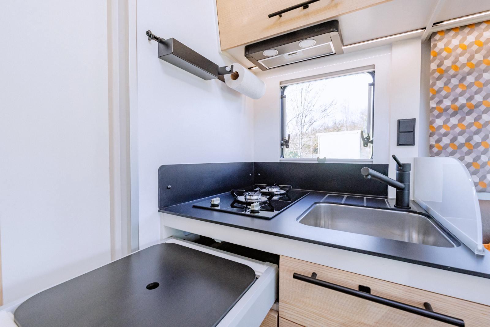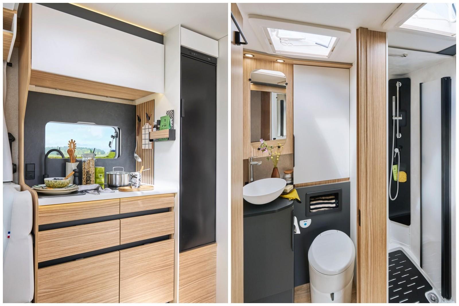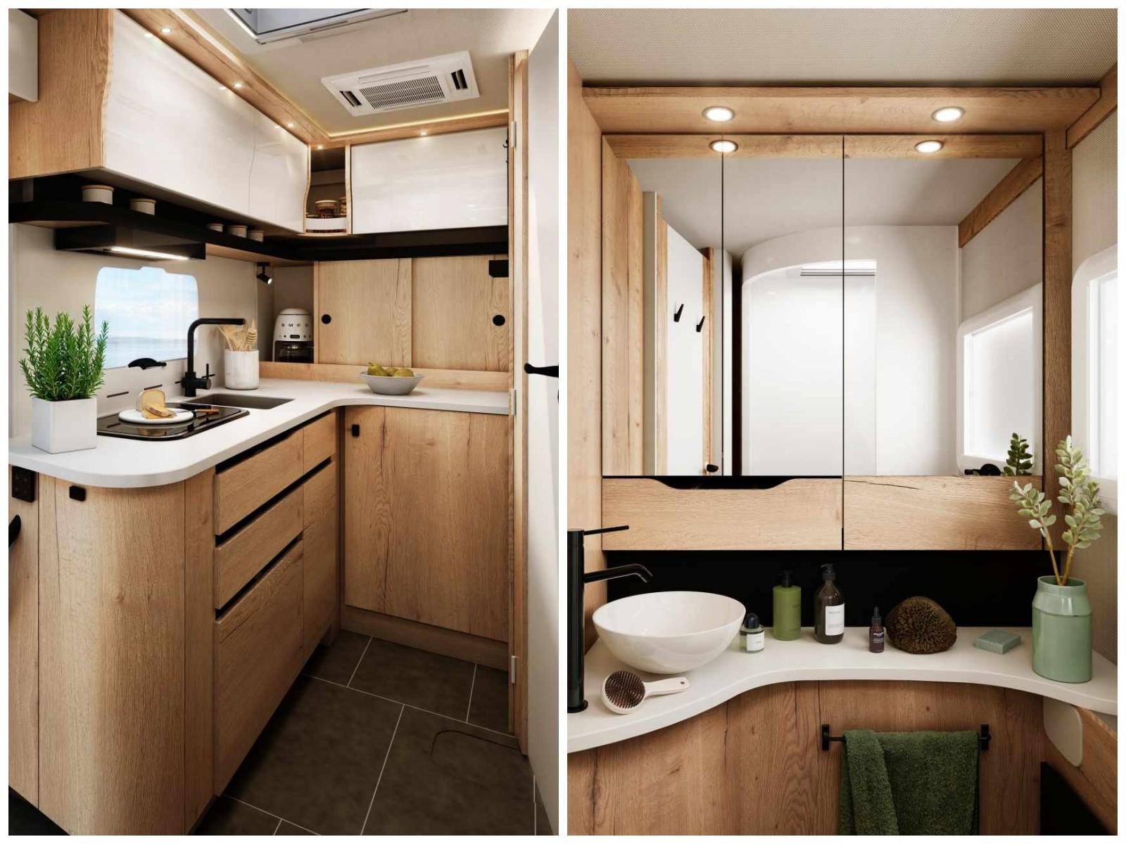 Avec le modèle Héritage 6,9 LF (6,90 m), Le Voyageur renoue avec le petit camping-car de luxe sans lit permanent sur Mercedes Sprinter et châssis AL-KO. Un pari osé ? Attendez de voir le résultat ! En journée, vous profitez de larges volumes aérés, d’une circulation fluide autour des banquettes face-face, de rangements généreux, d’une cuisine en L confortable à l’arrière attenante à la la salle d’eau. La nuit, le lit de pavillon électrique (190 × 200 cm) descend dans la longueur du véhicule. Cette architecture “open space” répond aux attentes de plus en plus fortes d’une clientèle qui recherche de la modularité plutôt qu’un lit fixe souvent disproportionné sur un véhicule court.