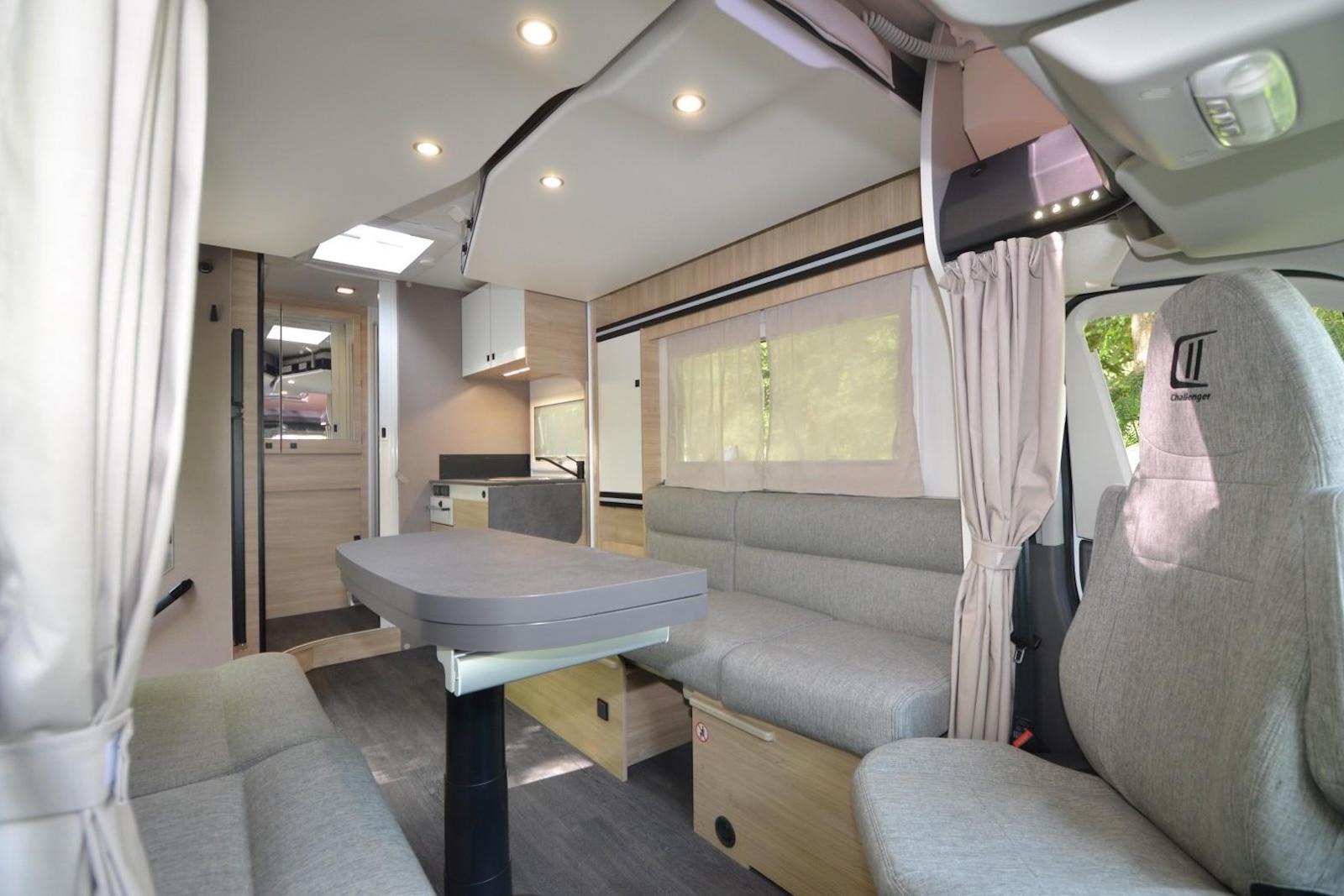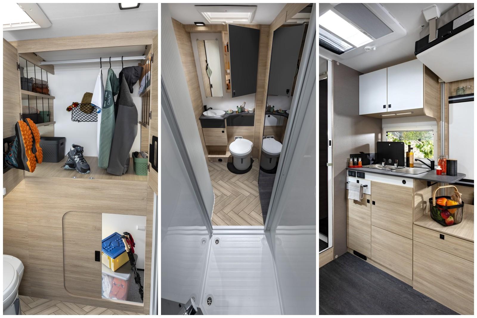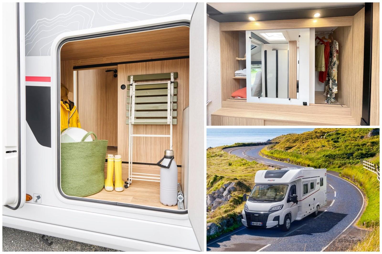 Long de 7,25 m, ce profilé Pilote revisite l’implantation avec salon en U + lit de pavillon. Avec comme attribut atypique, une soute accessible depuis le côté droit du véhicule. Parmi ses points forts, on retiendra son salon généreux pour six personnes et illuminé par trois larges baies, son lit électrique aux dimensions XL (200 x 160 cm), son large dressing surmontant la soute ou encore sa douche indépendante du cabinet de toilette. La décoration intérieure moderne, commune à l’ensemble des camping-cars Pilote, est aussi à nos yeux un vraie réussite.