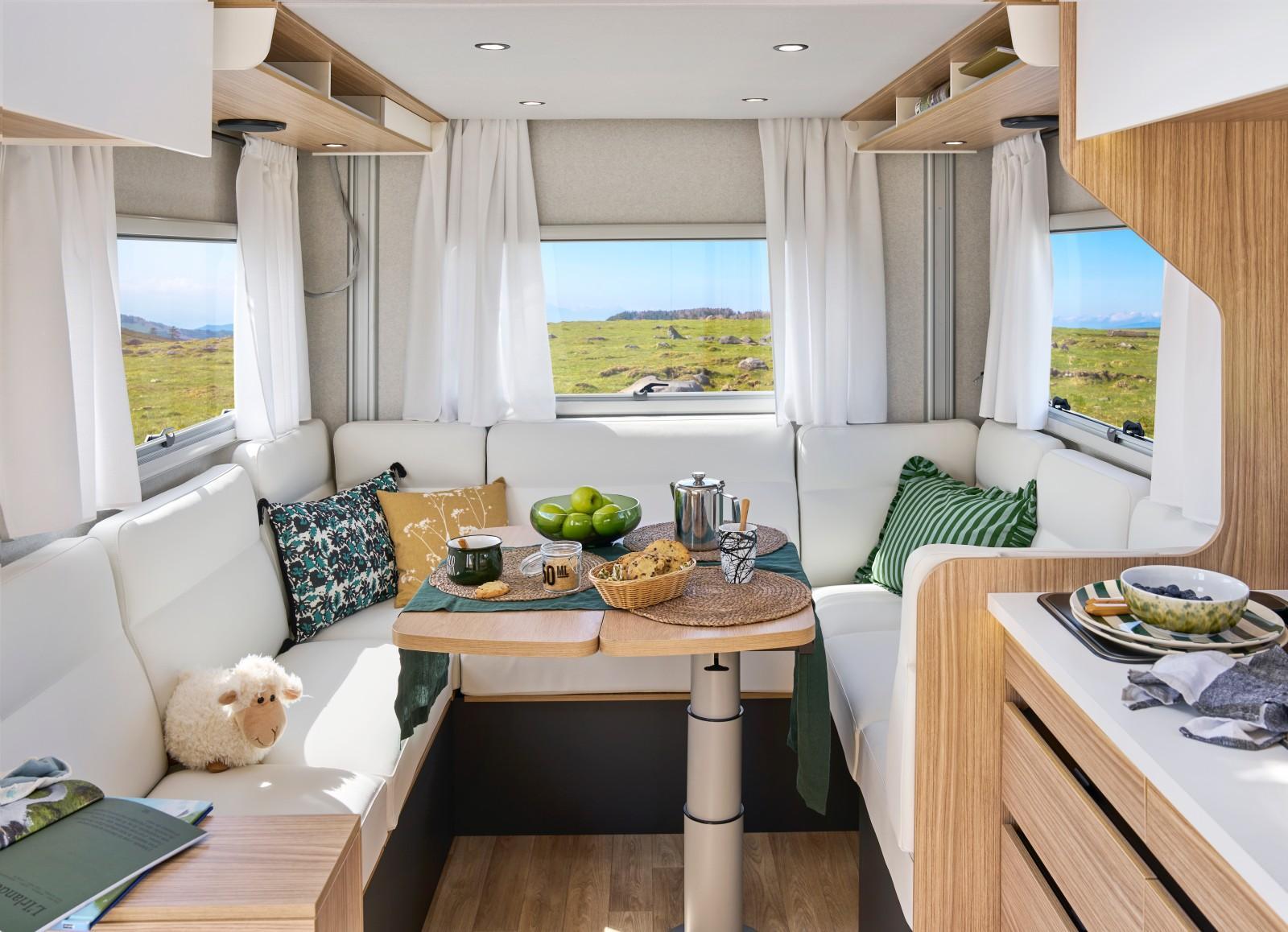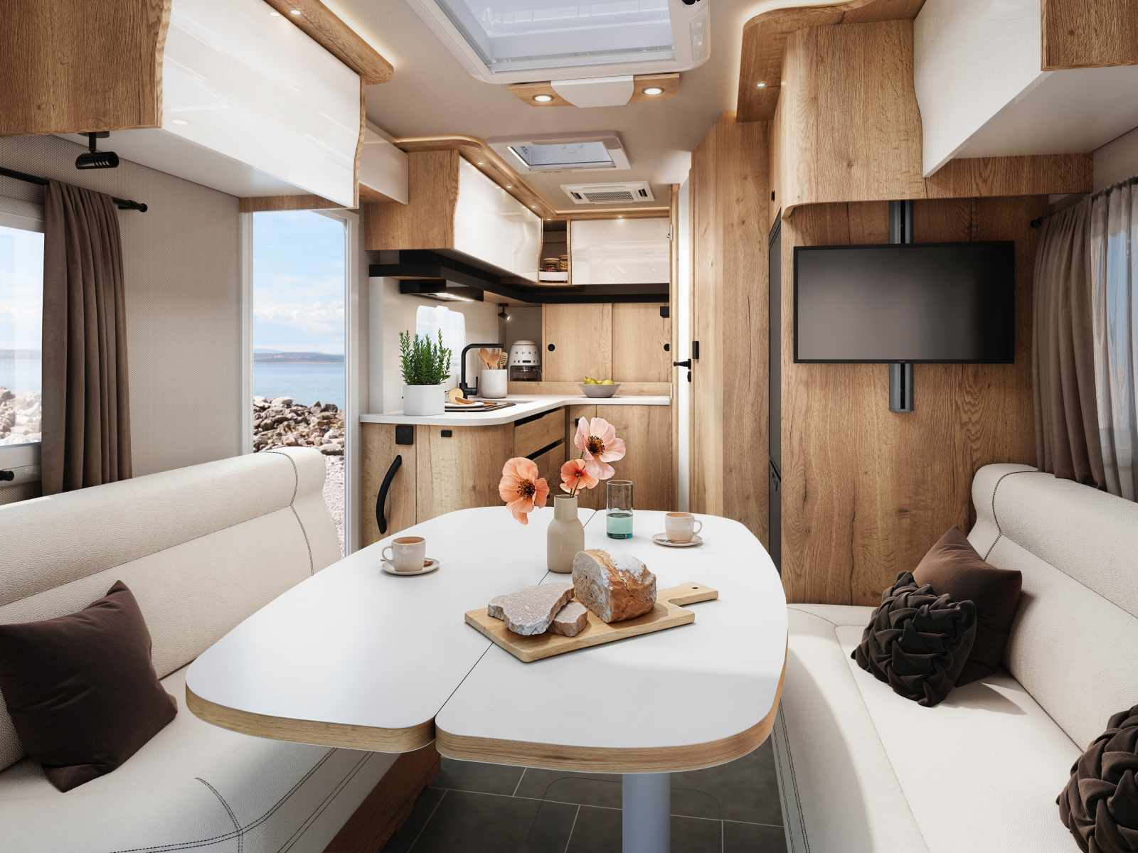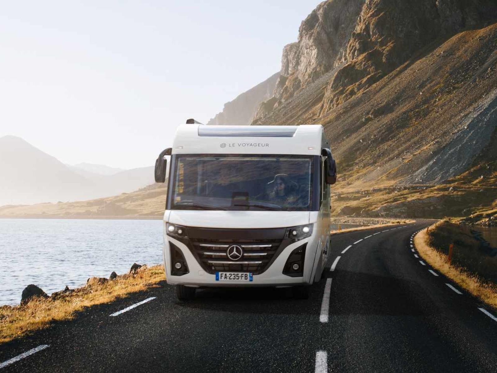 L x l x h : 6,90 x 2,25 x 3,00 m • Porteur/Motorisation : Mercedes Sprinter + AL-KO / 2,2 l 170 ch • PTAC : 4,5 T • Charge utile : 820 kg • Places route / nuit : 4 / 2 • Dimensions lit de pavillon : 200 x 190 cm • Volume frigo à compression : 175 l • Volume eau(x) propre/usées : 200 / 120 l • Chauffage : Truma Combi 6E (6000 W) au diesel / 230 V • Tarif de départ 2026 : 150 900 € (+ 30 000 € avec le pack Luxe)