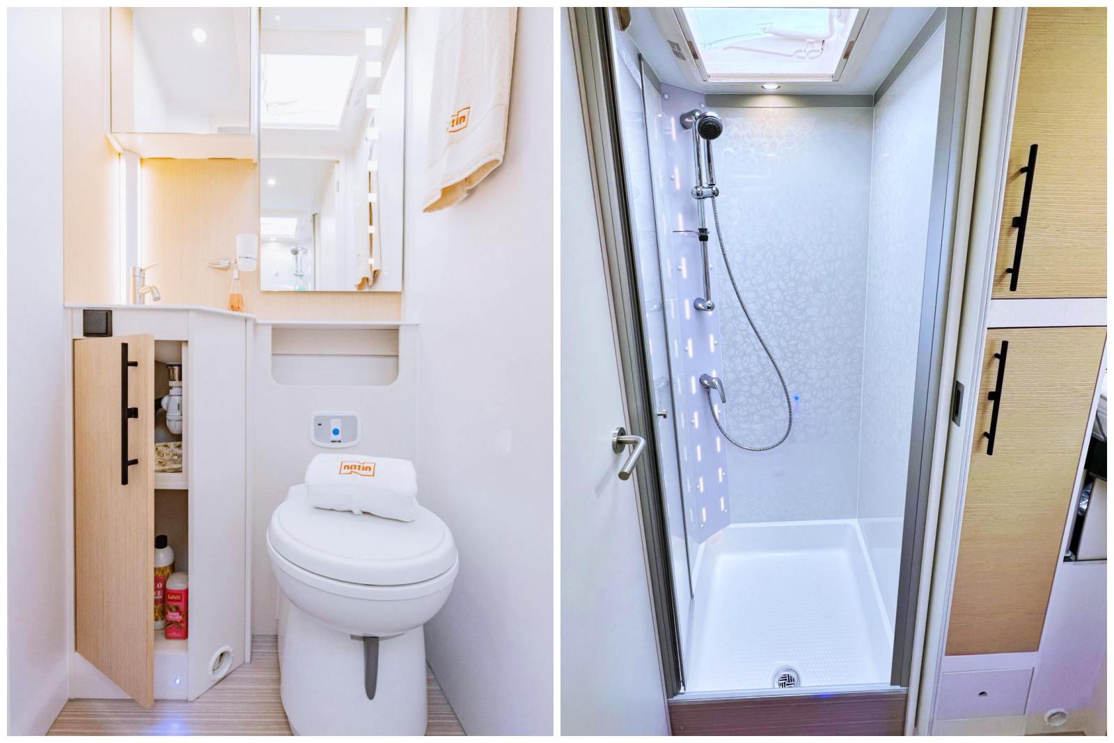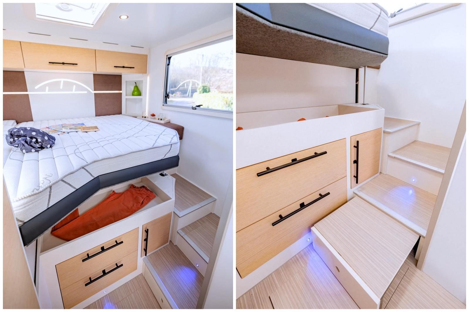 Quel intérêt d’opter pour un lit transversal sur un camping-car de 7 mètres ? En passant à la loupe ce Notin Vitoria, on se rend compte qu’il minimise les compromis et coche la plupart des cases recherchées par les camping-caristes : salon face-face, douche indépendante du bloc WC et nombreuses solutions de rangements (dont une soute spacieuse). Le lit dans la largeur, accessible par un escalier en pied et réglable en hauteur électriquement, se montre aussi novateur que fonctionnel. Avec cette solution, Notin parvient à atténuer l’un des défauts principal de ce type de couchage dans la largeur. Le second occupant, celui qui dort au fond, n’a plus à enjamber son partenaire lorsqu’il souhaite se lever le premier : il lui suffit de se glisser hors du lit via l’escalier.