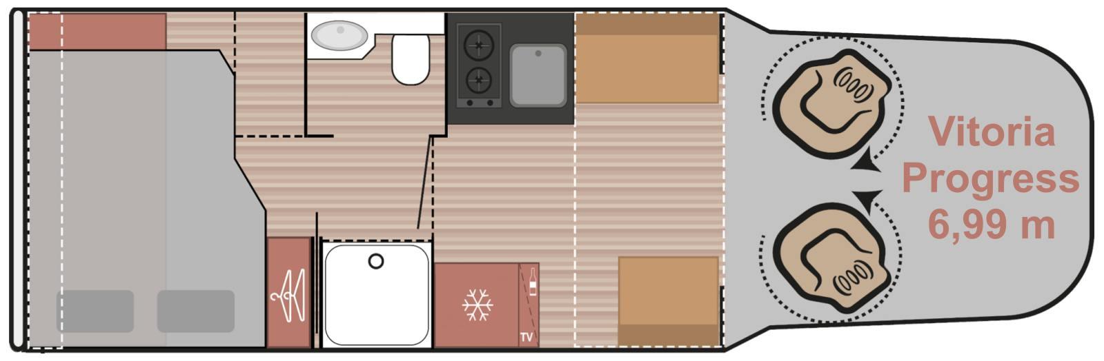 L x l x h : 6,99 x 2,35 x 2,92 m • Porteur/Motorisation : Ford Transit / 2,0 l 130 ch • PTAC : 3,5 T • Charge utile : 474 kg • Places route / nuit : 4 / 4 • Dimensions lit jumeaux de pavillon : 200 / 190 x 90 cm • Volume frigo : 150 l • Volume eau(x) propre/usées : 105 / 100 l • Chauffage : 4000 W au diesel • Tarif de départ 2026 : 66 990 €