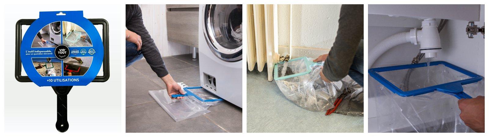 Le Vid’tout a d’abord été pensé pour les vidanges d’accès difficiles, comme les machines à laver, les radiateurs ou les siphons d’évier. Il a l’avantage de se faufiler partout dans les endroits fins et exiguës. Mais le Vid’tout offre un spectre d’utilisations plus larges, il peut servir de poubelle de table portative, et se révèle également très pratique pour le ramassage de feuilles d’arbres ou de déchets.