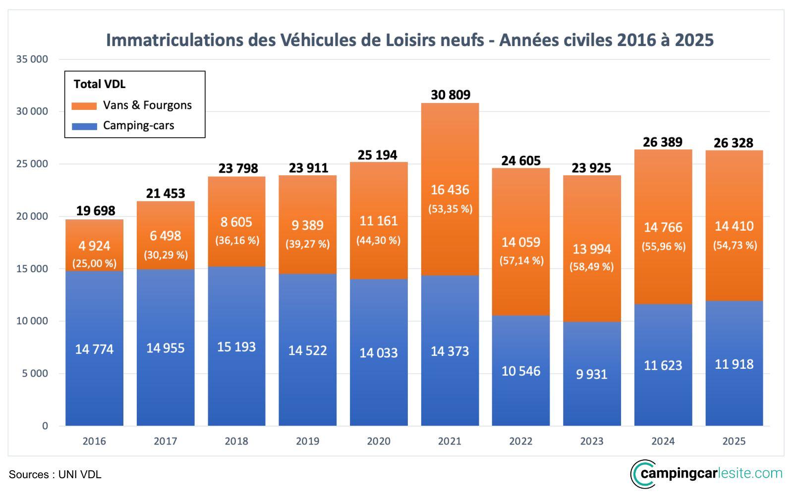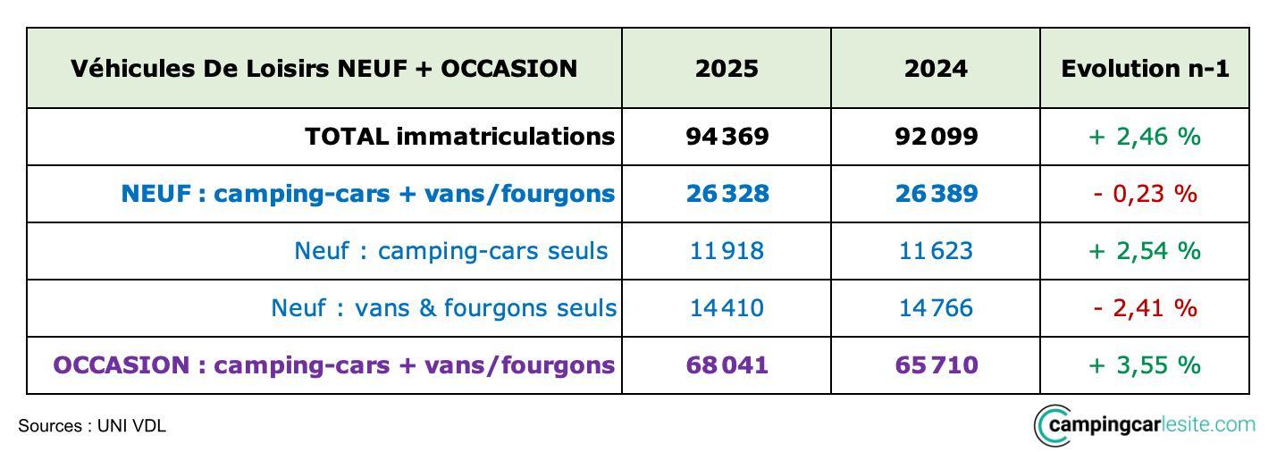 Si une saison complète s’entend de début septembre à fin août dans l’univers des véhicules de loisirs, les chiffres donnés par l’Union des industries du véhicule de loisirs (UNI VDL) à fin décembre 2025 permettent de dresser un premier bilan de l’année civile écoulée. Côté neuf, on enregistre 26.328 immatriculations, un chiffre stable, -0,23% par rapport à 2024. On observe un léger recul des vans et fourgons (-2,41 %) qui passent de 14.766 ventes en 2024 à 14.410 en 2025. C’est l’inverse pour les camping-cars (profilés, intégraux et capucines) qui voient leurs ventes en hausse de +2,54% (de 11.623 à 11.918 véhicules).
