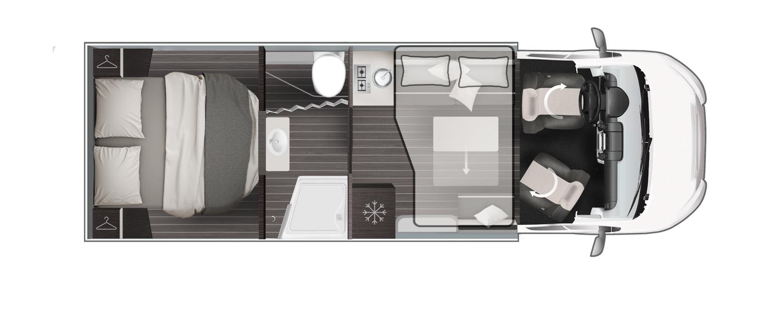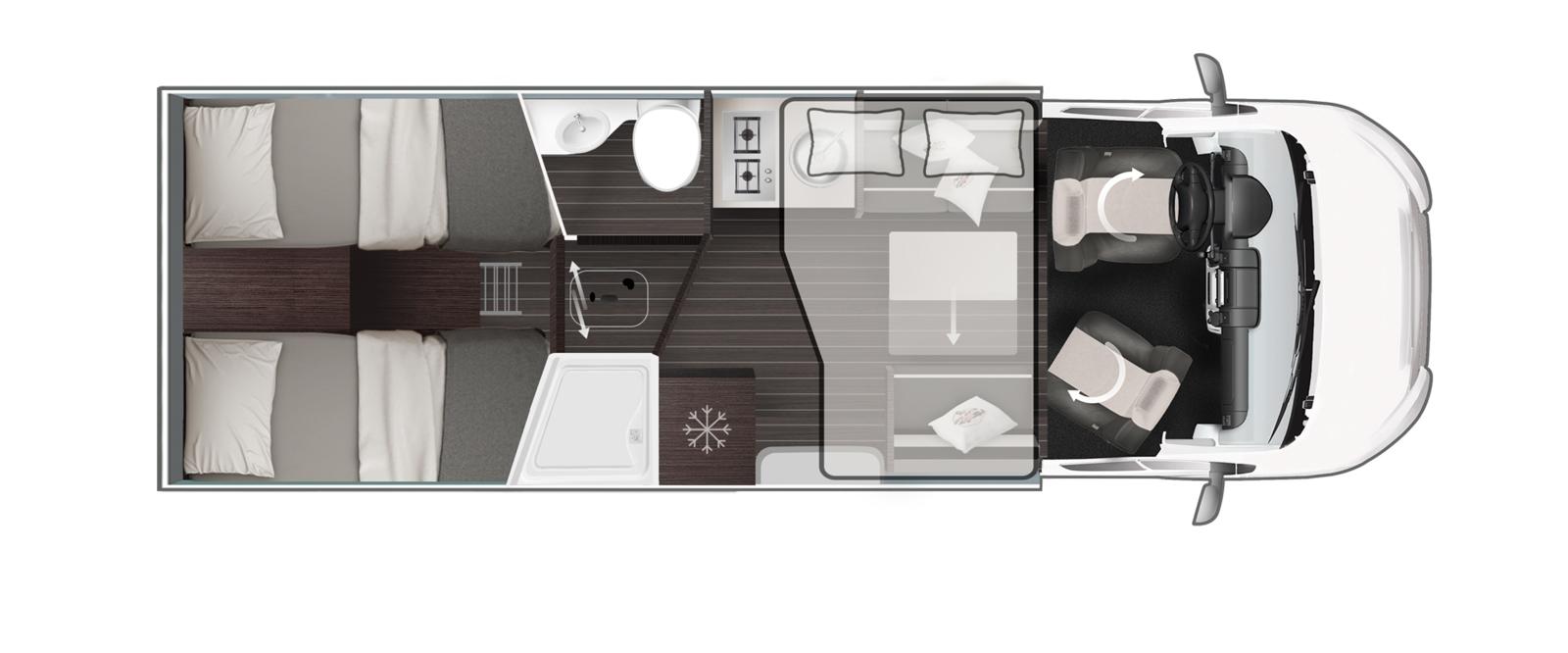 Si le 287 TL fait le choix des lits jumeaux associés à un salon face-face, le 266 TL met quant à lui en œuvre aujourd’hui très rare sur le marché. Un lit central, un salon face-face… et une salle de bain traversante au sein de laquelle douche et toilettes s’installent de part et d’autre tandis que la vasque trône en partie centrale.