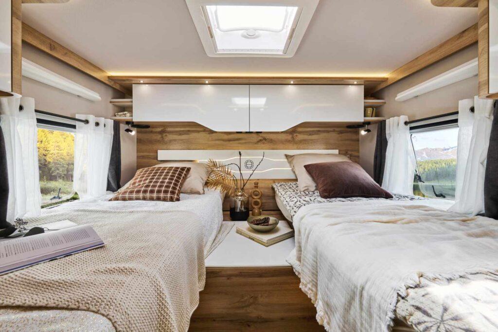 Sensiblement plus grand (7,91 m), le LVXH 7.9 GJL associe des lits jumeaux et une dînette composée d’un canapé en L et une banquette sur la paroi opposée. Cette configuration ouvre la possibilité d’ajouter une 5ᵉ place carte grise en option. Autre atout apprécié, le mécanisme électrique permettant de rapprocher les deux lits séparés pour former un couchage central ! Autrement dit, si vous hésitez entre les deux dispositions, c’est le véhicule idéal !