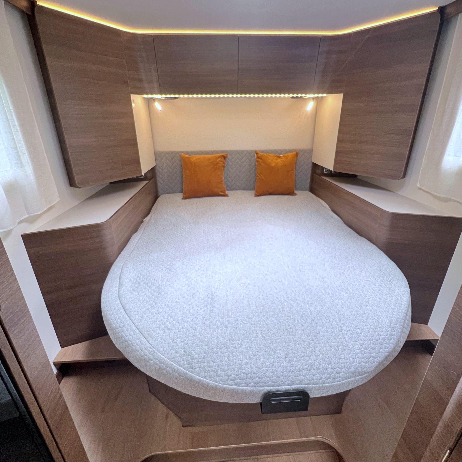 On a beau fouiller dans les catalogues 2026 des marques de camping-cars, les intégraux de moins de 7 m font l’impasse sur le lit central, tous exclusivement aménagés avec des lits jumeaux, hormis deux exceptions en lits superposés (Benimar Amphitryon A940, Itineo Famili SBD700). A dire vrai, avec le 850F le groupe Rapido n’en est pas à son premier coup d’essai, on doit au constructeur multi-marques l’intégral étroit Rapido C86i (6,99 m) et l’Itineo Famili CM660 (6,61 m), deux intégraux arborant un lit central dans des formats compacts.