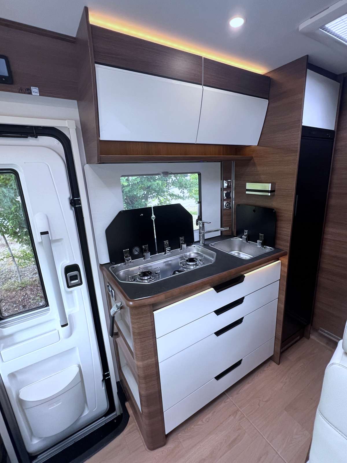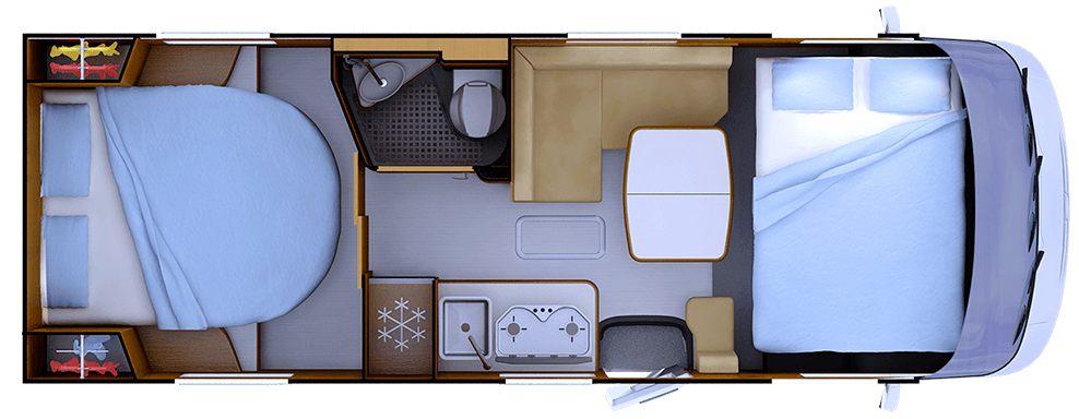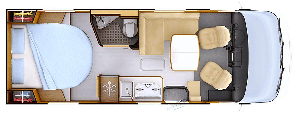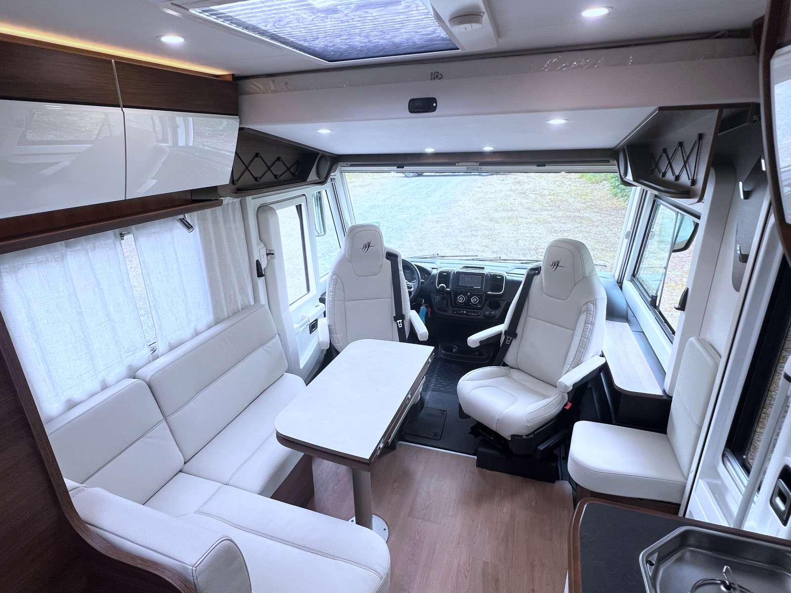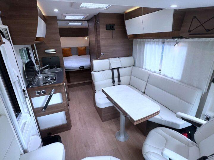 On retrouve à droite, côté porte-cellule, le bloc cuisine, au format certes compact mais bien équilibré avec ses tiroirs et placards spacieux. La colonne qui sépare la cuisine de la chambre enserre un volumineux réfrigérateur slim de 135 L. L’avant de l’intégral est occupé par un confortable salon en L, complété par un siège latéral, un espace baigné de lumière grâce à une large baie et le pare-brise panoramique en cabine. Le salon offre deux couchages supplémentaires dans le lit cabine escamotable (190 x 145 cm). Celui-ci peut être remplacé en option par un lit dinette une place (175 x 90 cm).