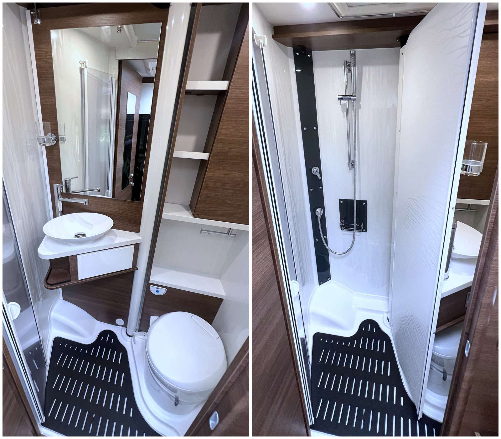 L’intégral 850F est donc né sous le sceau de l’expérience, celle d’associer confort et compacité dans un espace contenu. Au programme, une vrai chambre recevant un lit de grande dimension, 194 cm de large et 150 cm de large, dont le sommier est partiellement rétractable pour faciliter le passage en pied de lit. Sur le coté gauche du camping-car, Rapido retient une salle de bain modulable Duo’Space. Gage de gain d’espace, elle permet d’alterner douche et cabinet de toilette par le simple pivotement d’une paroi.