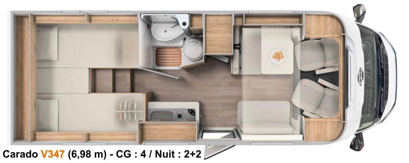 Outre cet astucieux lit mural escamotable, le Carado V347 dispose d’un agencement bien équilibré avec son bloc cuisine compact associé au frigo de 137 L, sa salle d’eau Vario à paroi pivotante, ainsi que sa chambre dotée de lits jumeaux sur soute garage.