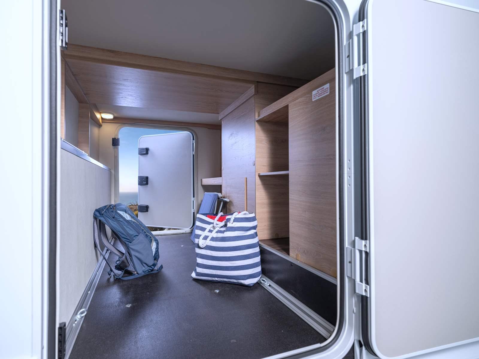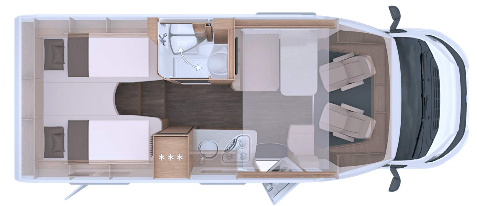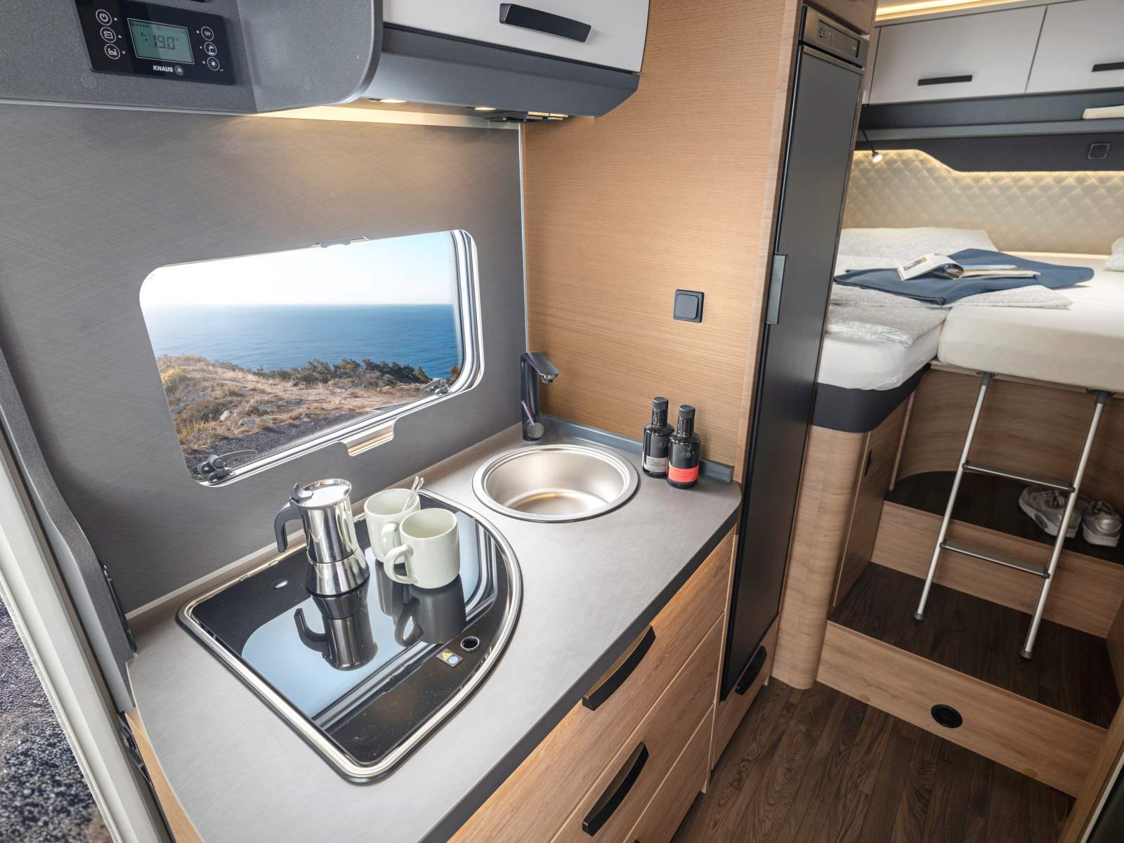 Au centre, on profite d’un bloc cuisine avec plan de travail, réchaud, évier et nombreux rangements, complété par un frigo 142 L, l’espace bénéficie d’une très grande hauteur sous plafond qui affiche 2,15 m. Côté opposé, Knaus opte pour une salle de bain de type Vario, avec paroi pivotante pour optimiser l’espace. A l’arrière la chambre reçoit deux lits jumeaux sur soute.