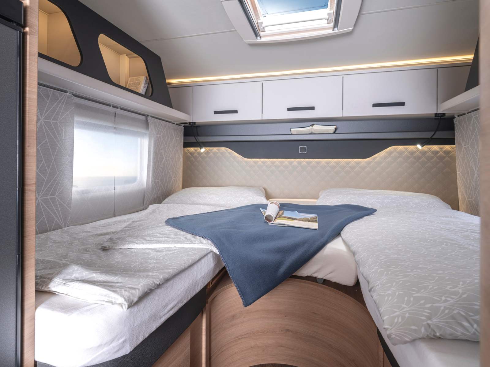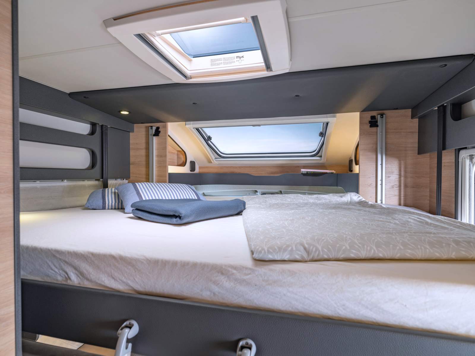 Pour cette série spéciale Knaus met en avant un des cinq profilés de la gamme Live Wave sur Fiat Ducato comptant un lit de pavillon de série. Parmi les trois modèles de 6,94 m de long, le 650 MG lit transversal, le 650 MF lit à la française et le 650 MEG lits jumeaux, c’est ce dernier qui fait l’objet d’une édition en finition exclusive Black Selection.