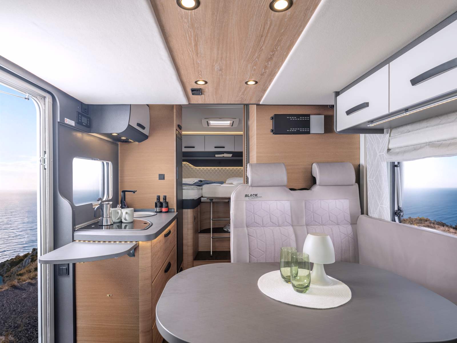 Comme son nom l’indique le Live Wave 650 MEG Black Selection adopte une cabine de couleur noir métallisé, qui contraste agréablement avec la cellule bicolore blanche et parois grises Campovolo parées de décos spécifiques. Un look haut de gamme parfaitement assorti à l’aménagement intérieur, dont le confort a été rehaussé pour cette série spéciale Black Selection.