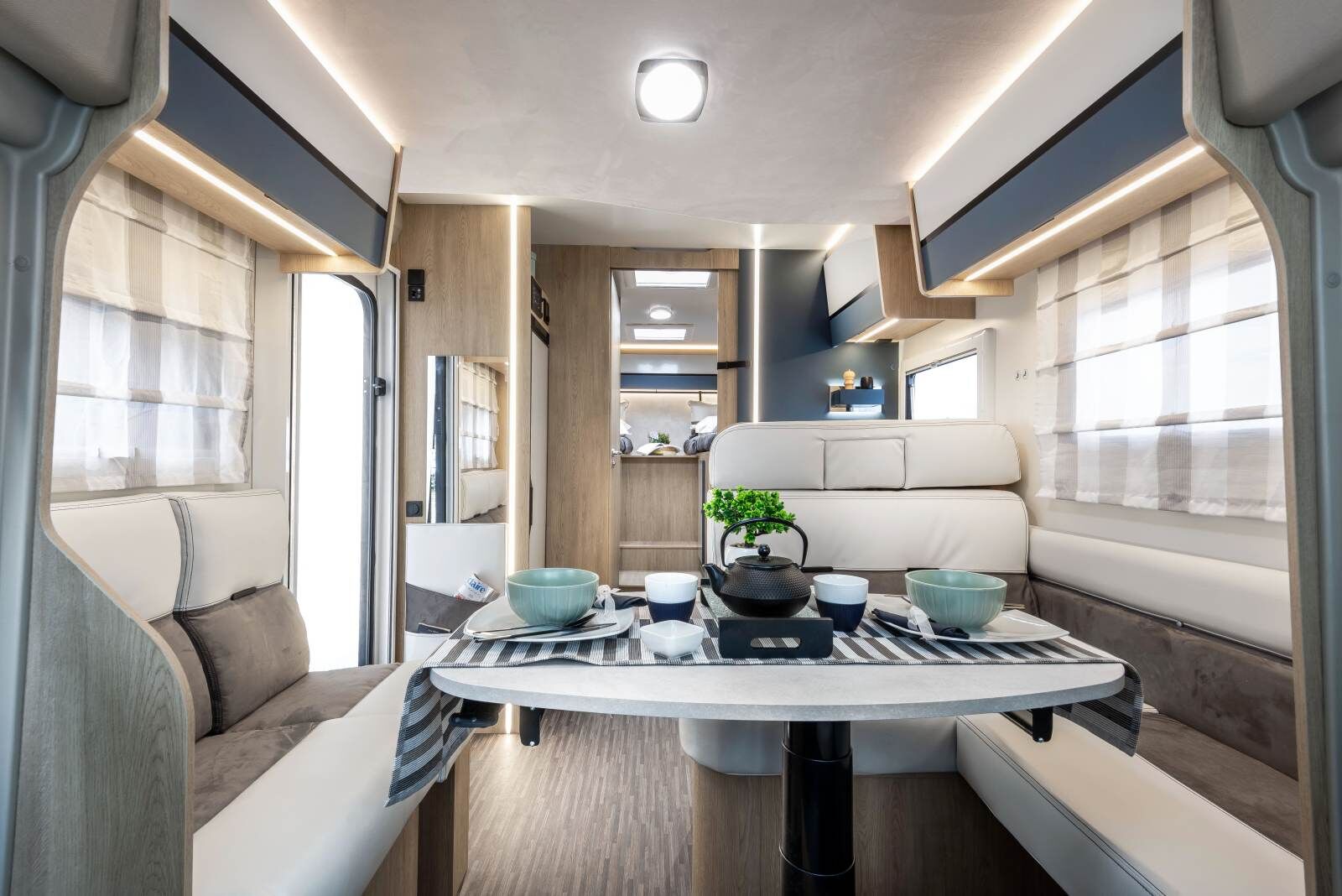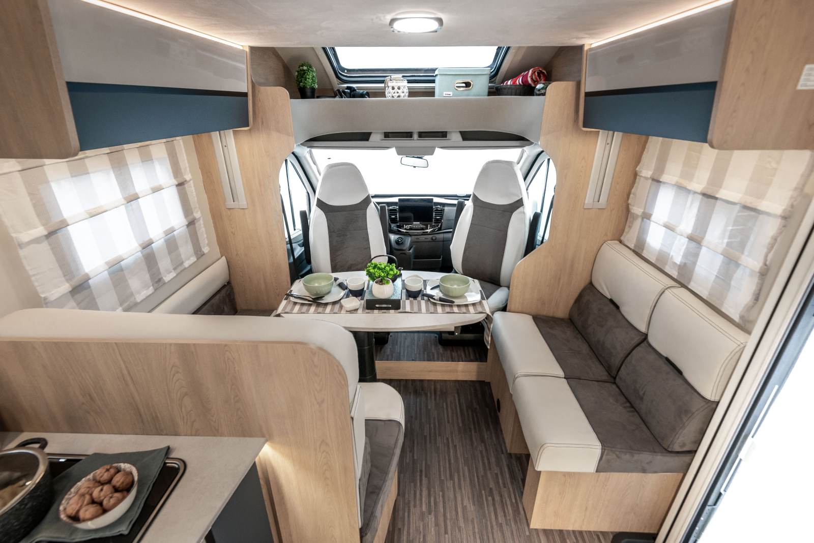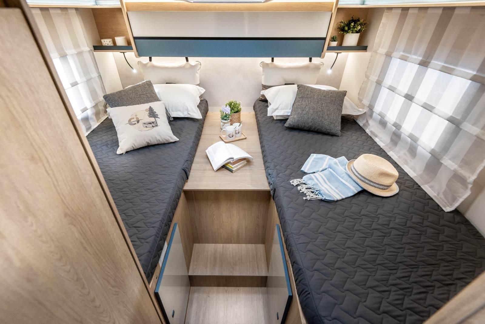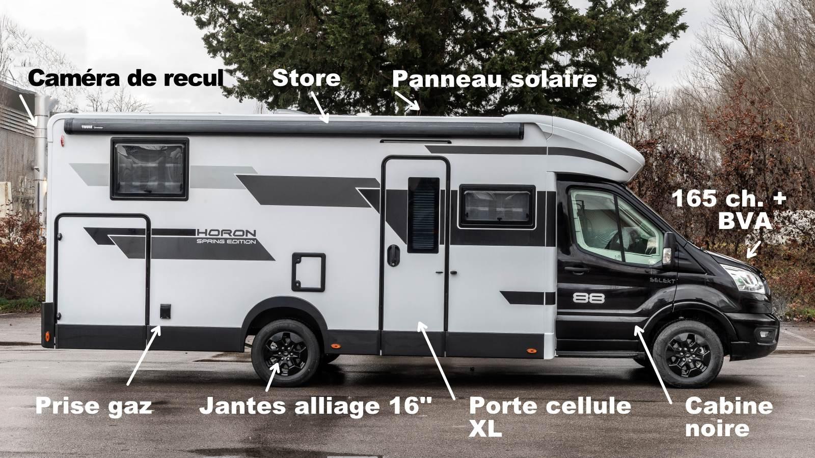 ✅ HORON 88 XT SPRING EDITION (7,45 m – 68 990 €) : Un camping-car homologué 5 places avec une dînette plus spacieuse (+ 25 cm pour la banquette à droite ; + 10 cm à gauche) sans perdre les lits jumeaux de grande taille (2m de long pour l’un).