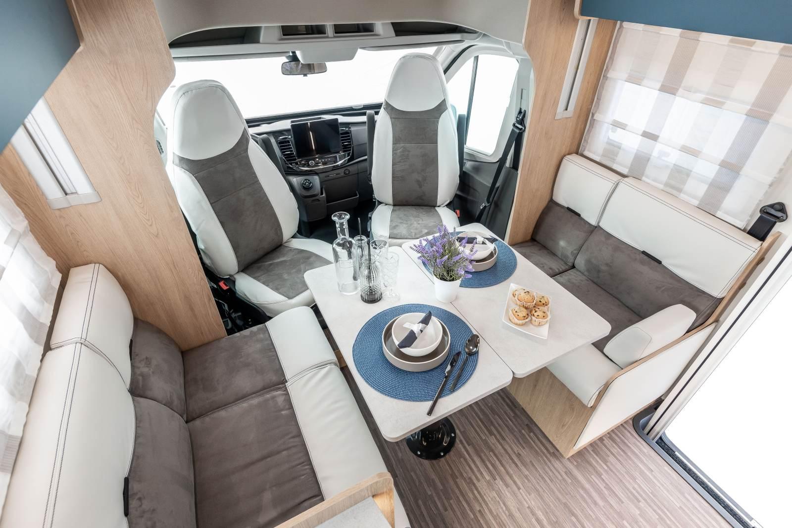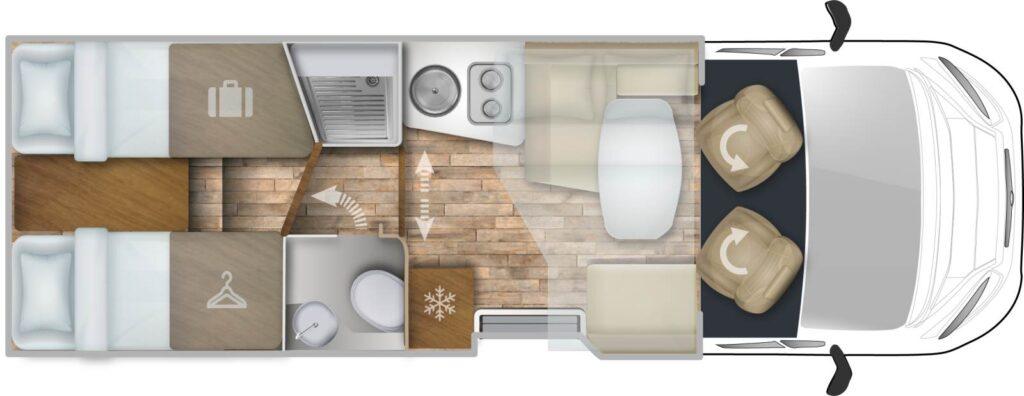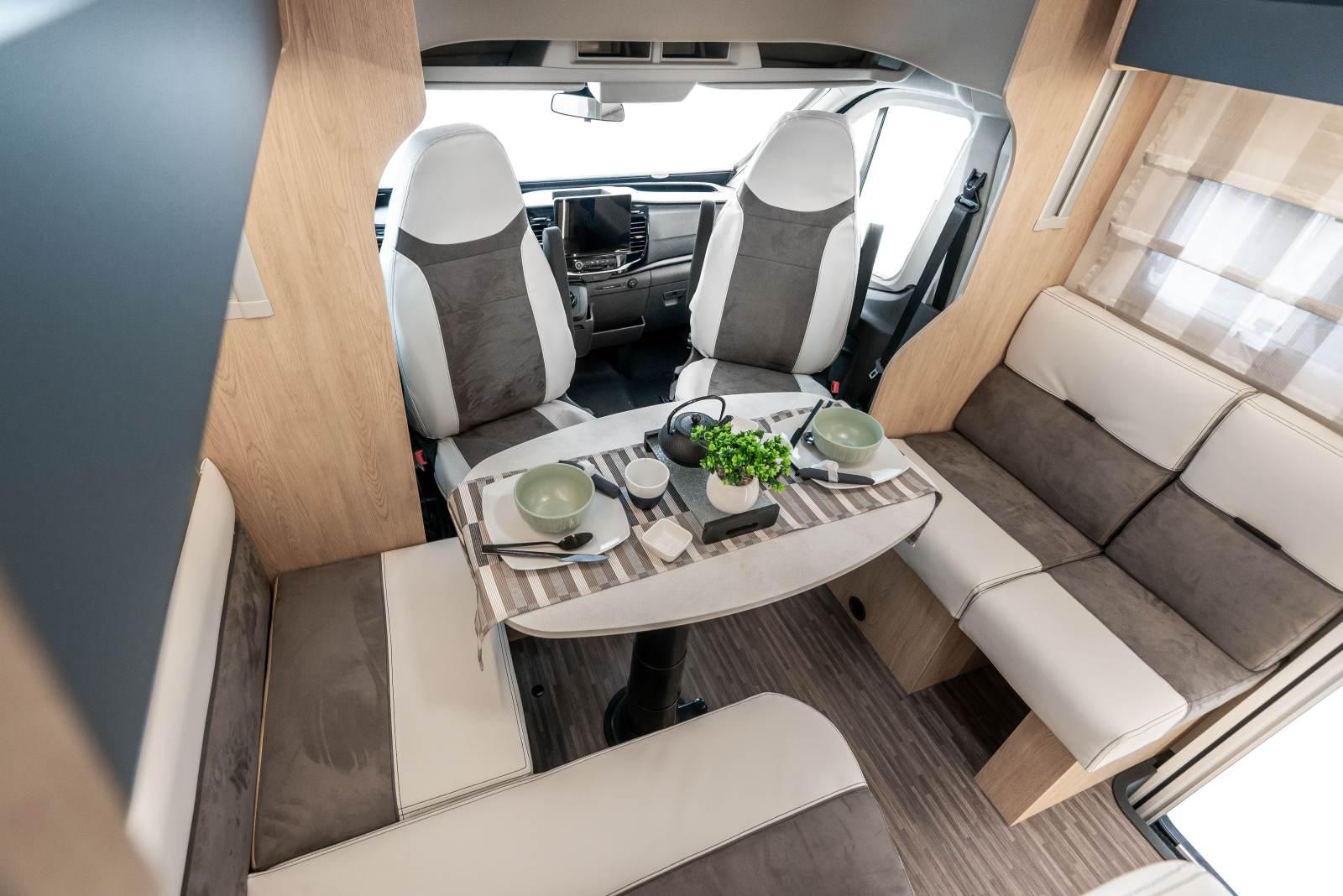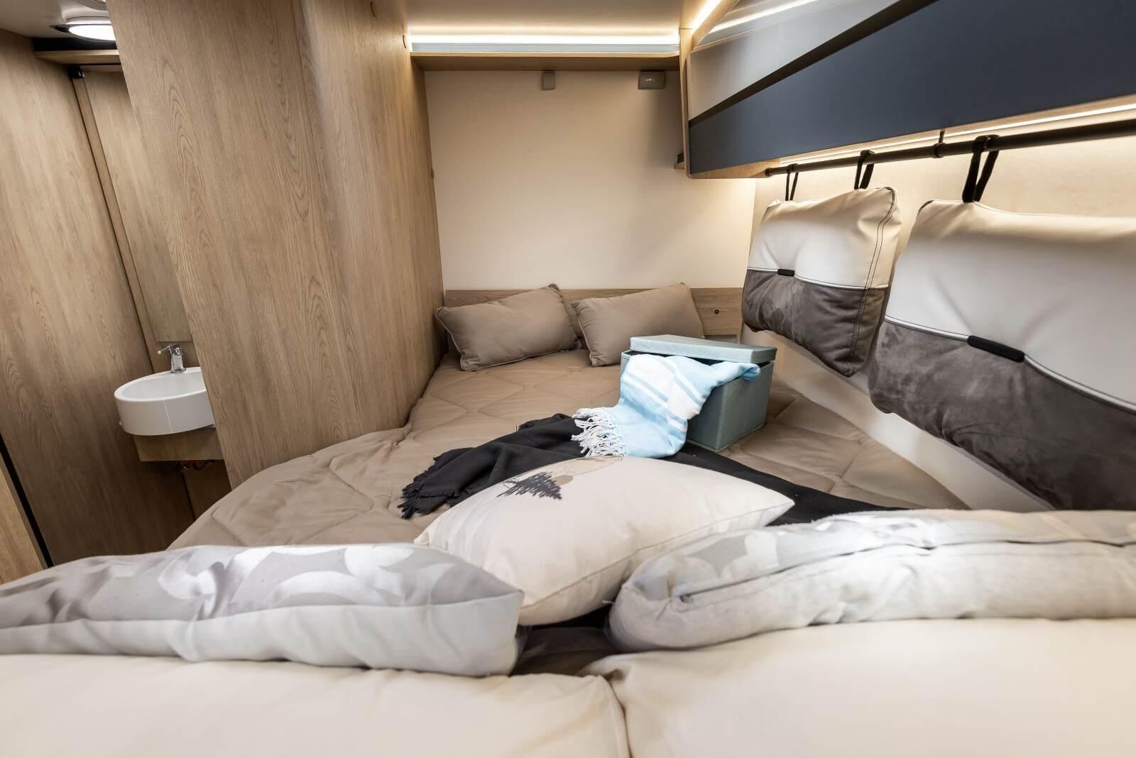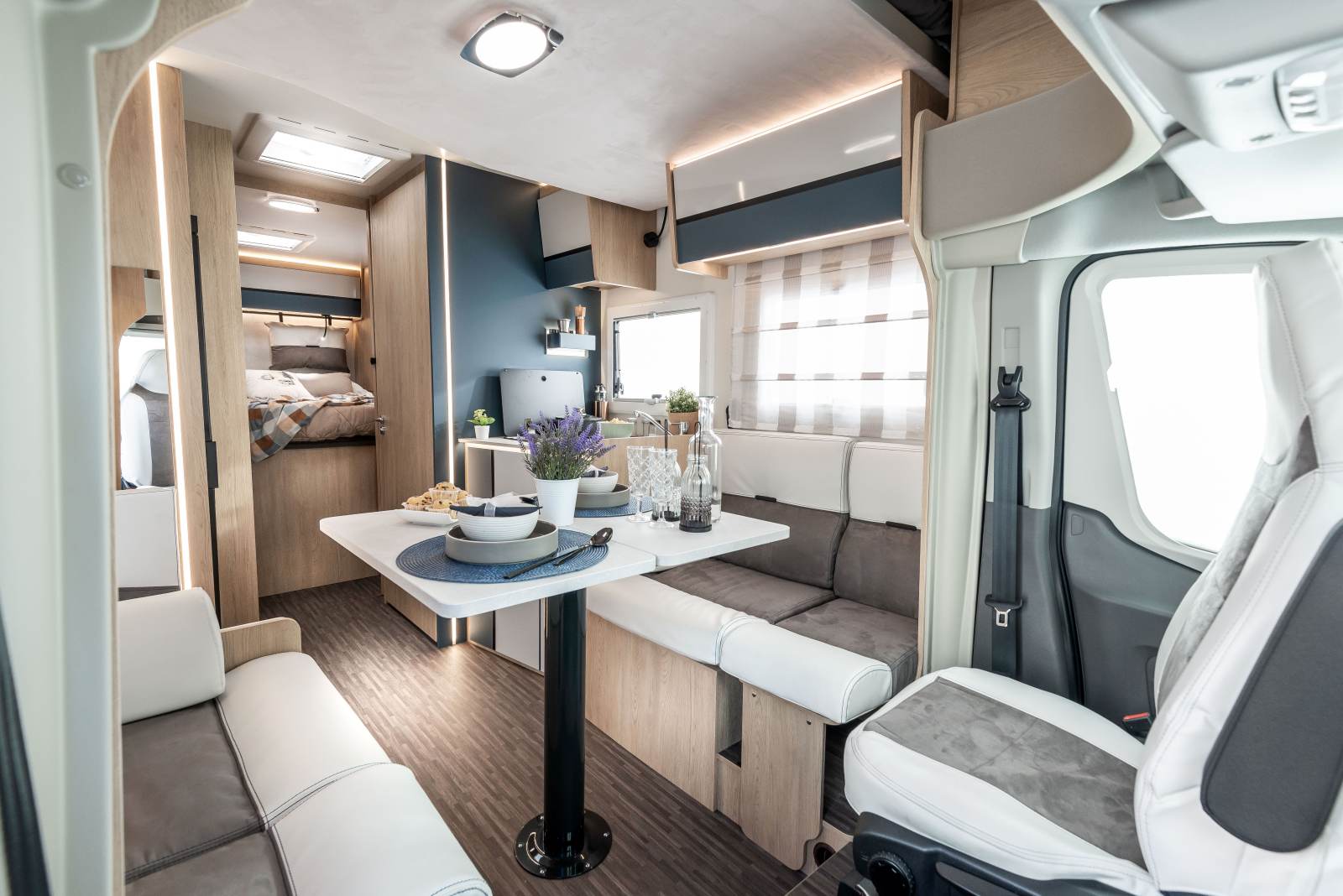 ✅ HORON 88 XT SPRING EDITION (7,45 m – 68 990 €) : Un camping-car homologué 5 places avec une dînette plus spacieuse (+ 25 cm pour la banquette à droite ; + 10 cm à gauche) sans perdre les lits jumeaux de grande taille (2m de long pour l’un).