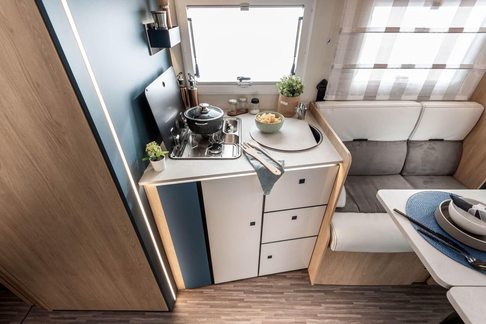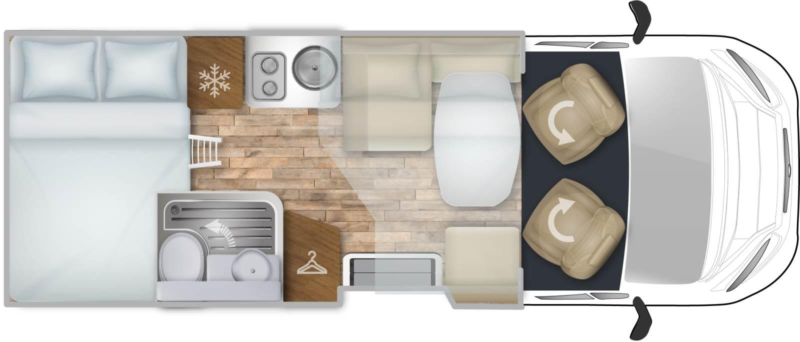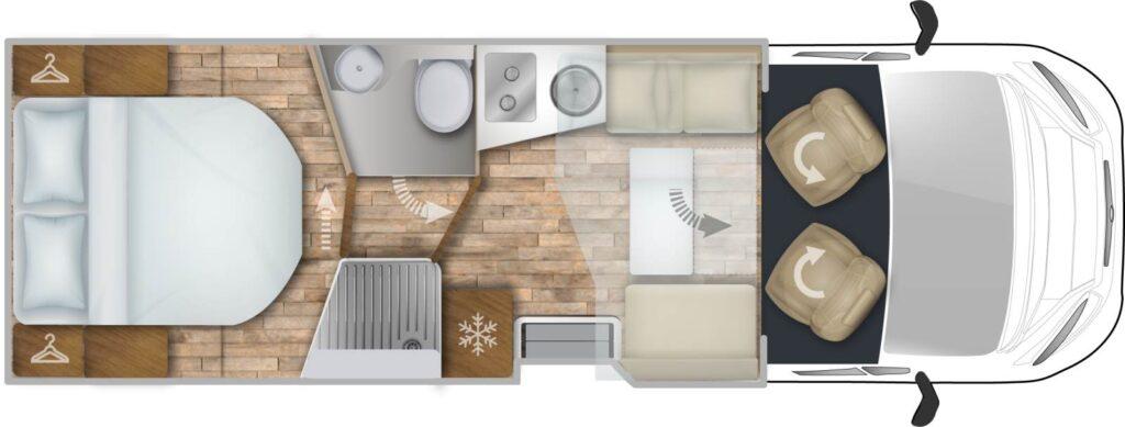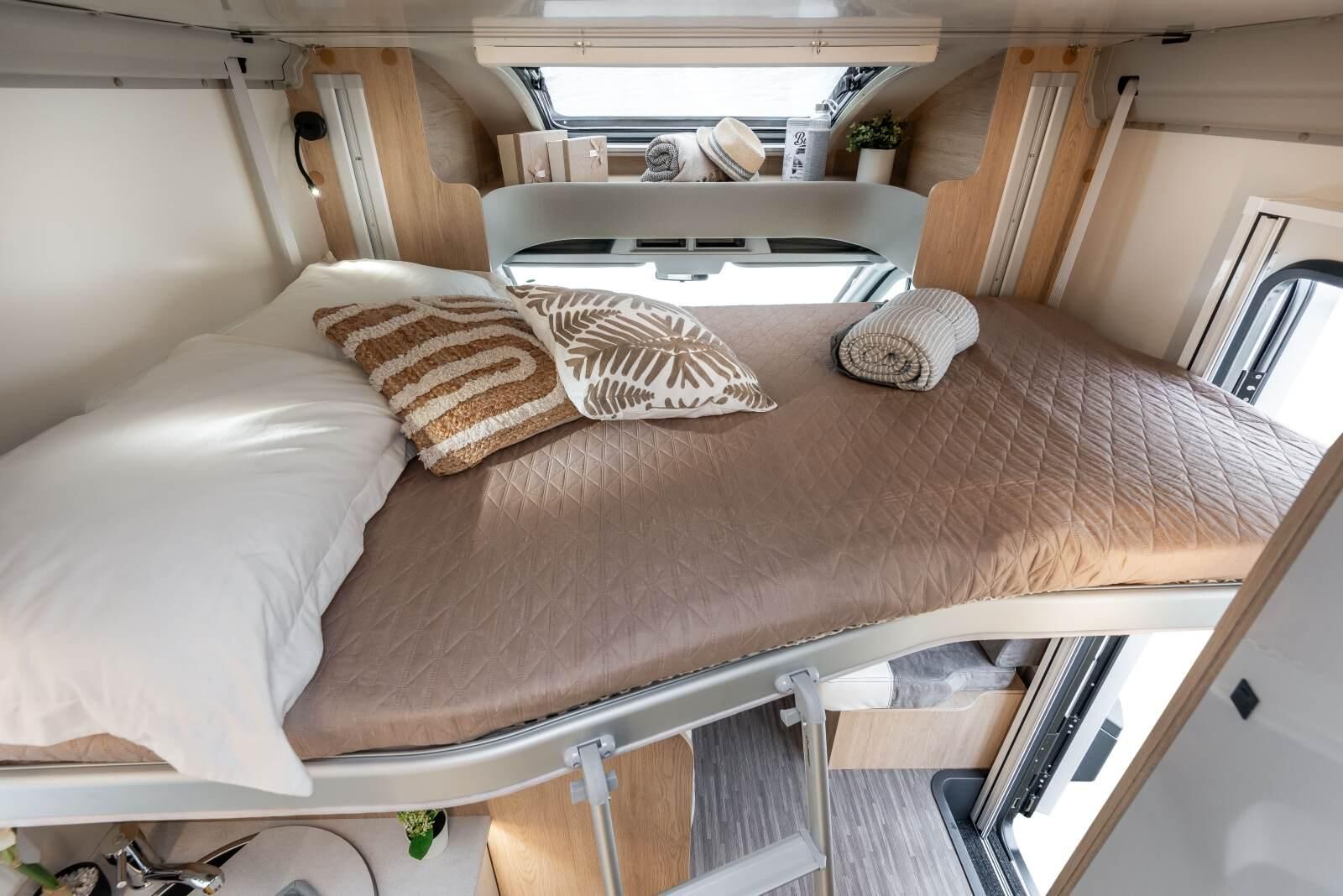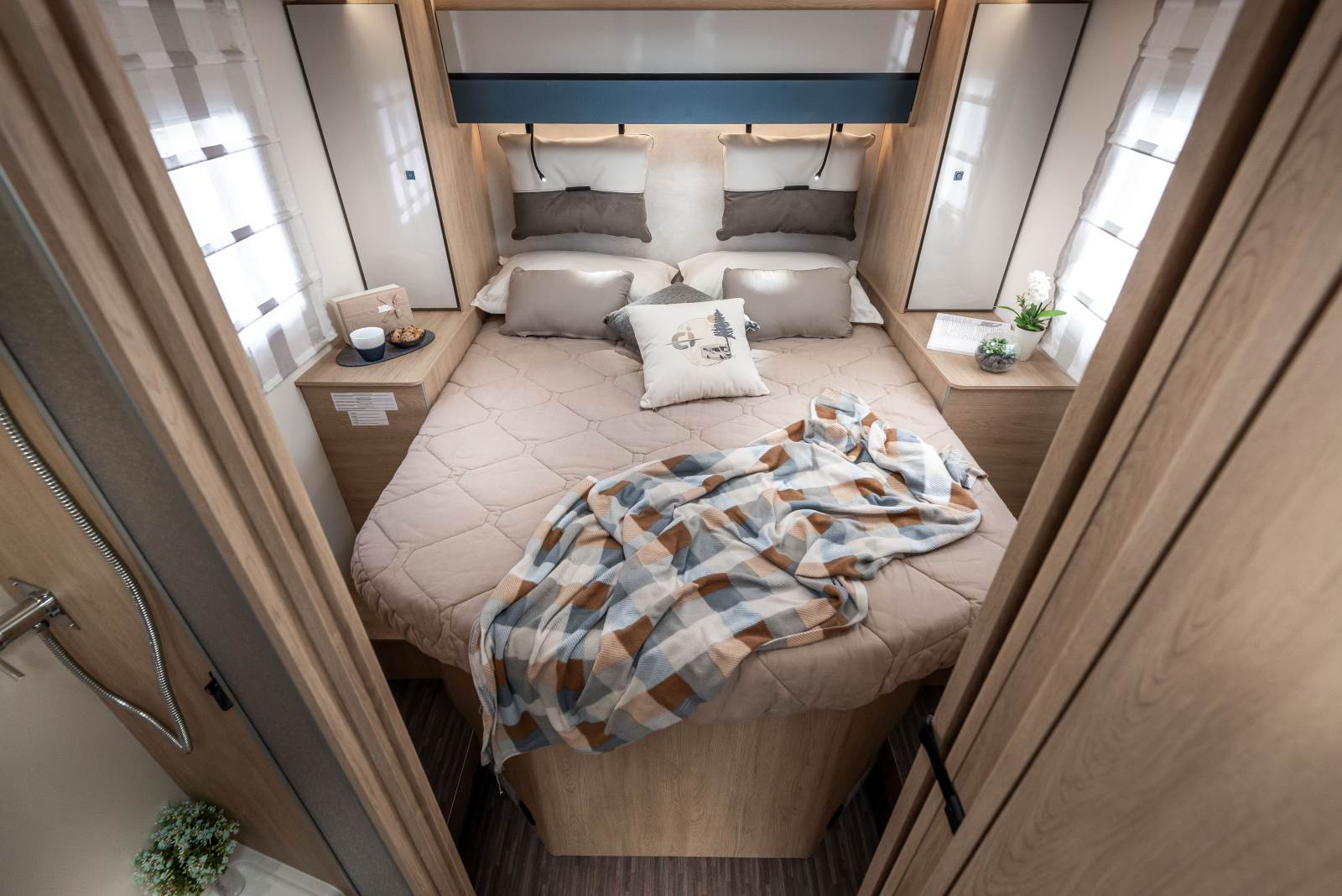 ✅ HORON 67 XT SPRING EDITION (7,45 m – 68 990 €) : Retour d’un grand classique, avec lit central, dînette face à face et réfrigérateur à compression 150 L. Le lit central (190 x 150 cm) réglable en hauteur cohabite avec un lit de pavillon double ( 203 x 135/114 cm).