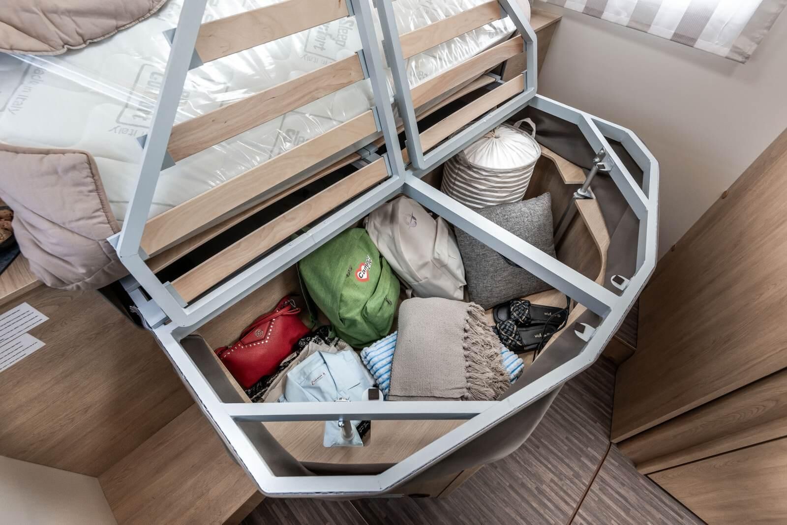✅ HORON FIT 94 XT SPRING EDITION (6,41 – 64 990 €) : Ce nouveau camping-car étroit (2,15 m de large, contre 2,35 m pour les deux autres) se distingue en tout point. La marque italienne l’assure sans détour : c’est le seul camping-car compact sur le marché avec 5 places nuit et 5 places homologuées ! Et tout ça dans 6,41 m. Un vrai tour de force qui devrait susciter l’intérêt des familles actives. Le lit transversal réglable en hauteur permet de gérer le volume du garage en fonction des besoins.