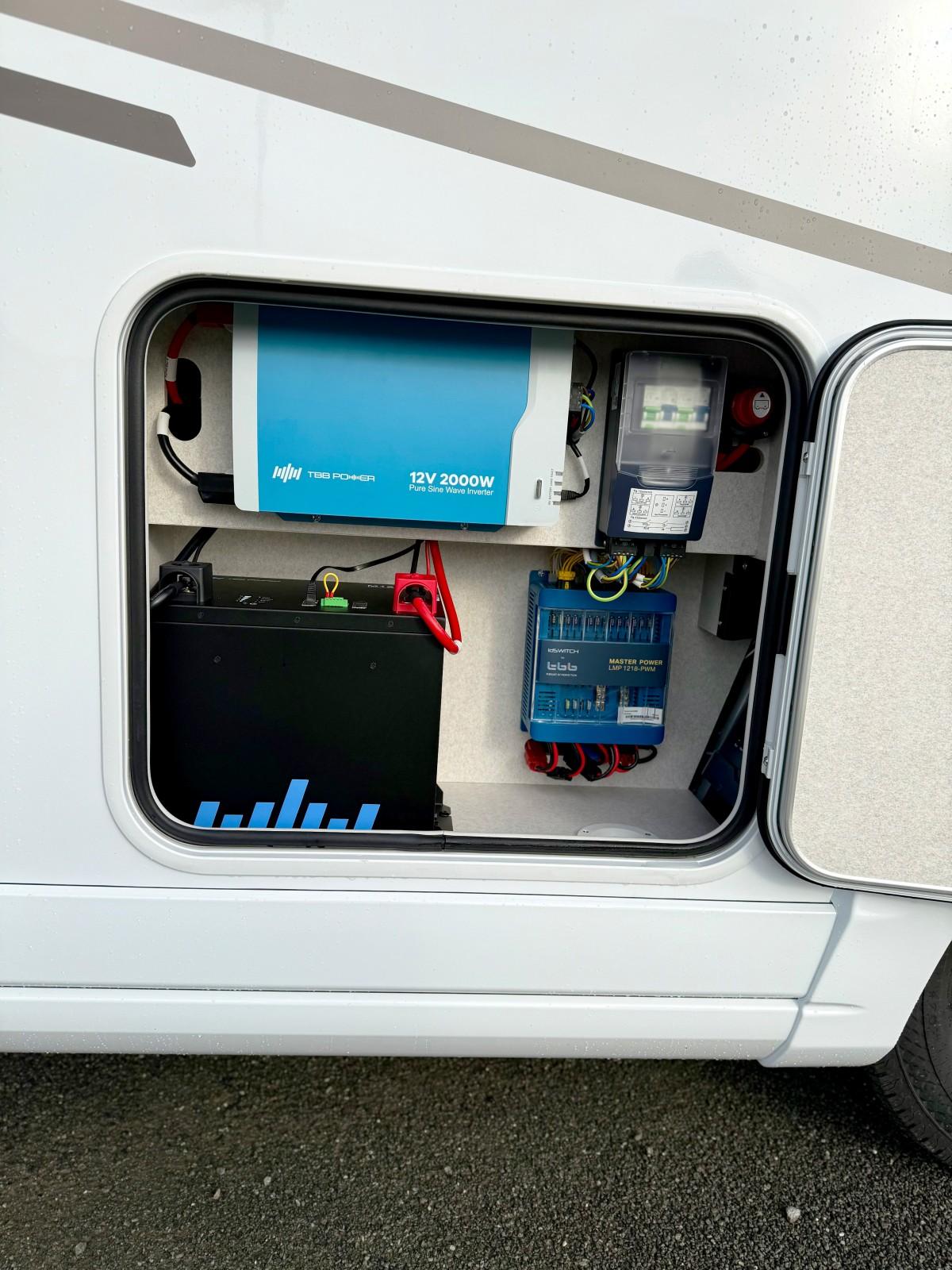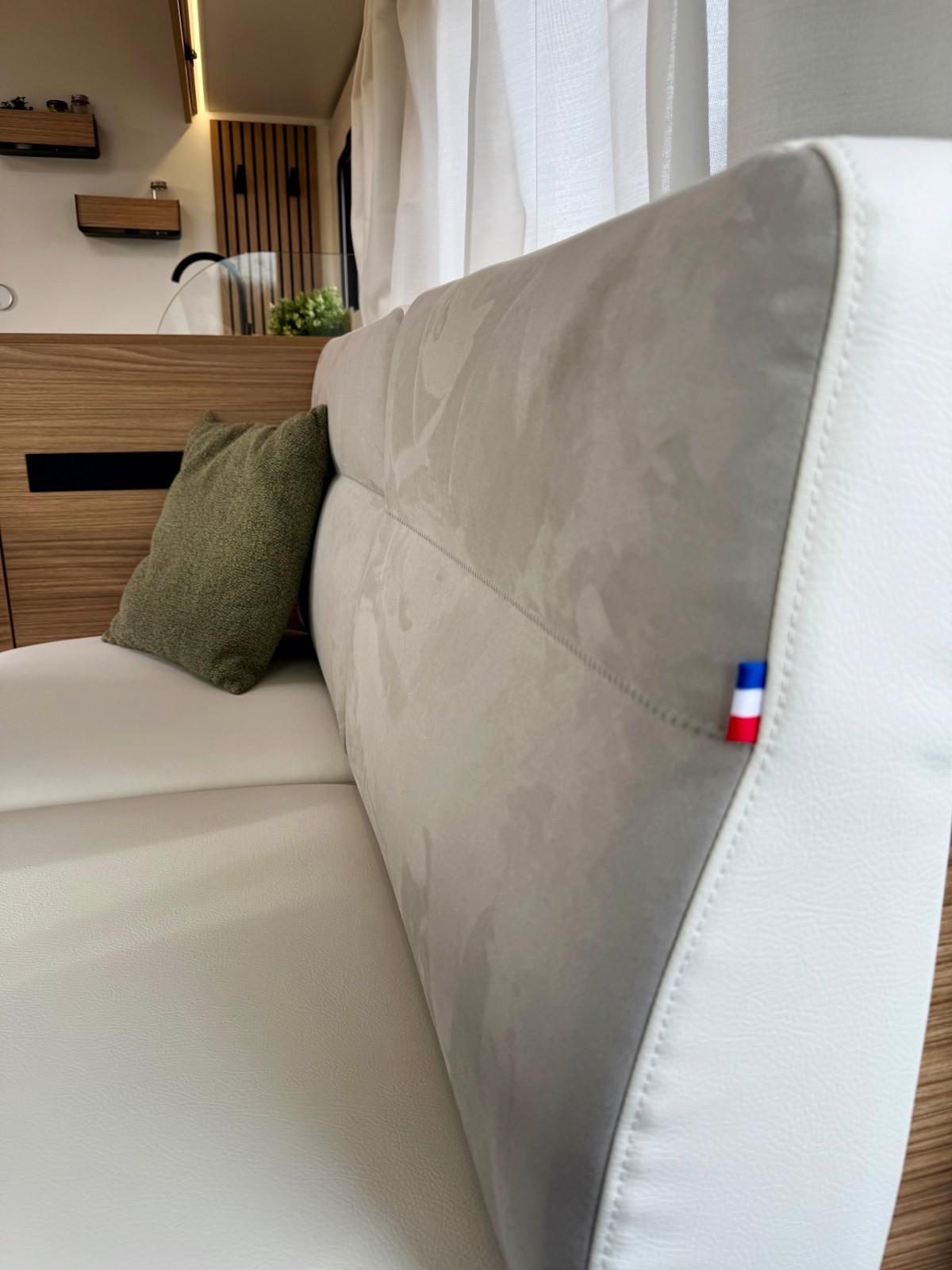 ✅ Équipement inclus : motorisation 2,2 l / 180 ch ; boite de vitesses automatique, pack Jantes (jantes alliage 16’’, volant en simili et aérateurs gris alu) ; pack Média 10’’ (autoradio Fiat avec écran 10’’, DAB, duplication smartphone Apple Carplay/Android Auto, caméra de recul, GPS, haut-parleurs dans la cabine et la cellule, climatisation automatique, chargeur à induction, tableau de bord digital) ; batterie lithium 300 Ah ; 2 panneaux solaires 210 W ; convertisseur 12 / 230 V pur sinus 2000 W ; combiné de chauffage/boiler Truma 6DE (diesel / électricité) ; réfrigérateur à compression ; éclairage dans la penderie de la chambre ; soute avec douchette eau chaude/eau froide, grand éclairage, rails et prise 230 V ; tiroir dans le bas de caisse ; prise gaz extérieure ; poubelle ; tapis antidérapants et accessoires pour compartimenter dans les tiroirs de cuisine ; housses de draps adaptées aux matelas ; nouvelle sellerie bi-ton et bi-matière simili/tissu