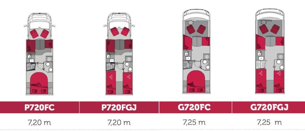 Pour composer cette sélection de choc, Pilote a retenu – sans surprise – des modèles classés dans le top de ses ventes : les profilés de 7,20 m de long P 720 FC (lit central) & P 720 FGJ (lits jumeaux) et les intégraux de 7,25 m G 720 FC (lit central) et G 720 FGJ (lits jumeaux). Tous sont greffés au châssis Fiat Ducato, animé par un moteur 140 ch pour les profilés et 180 ch pour les intégraux, couplé à une boite de vitesses automatique.