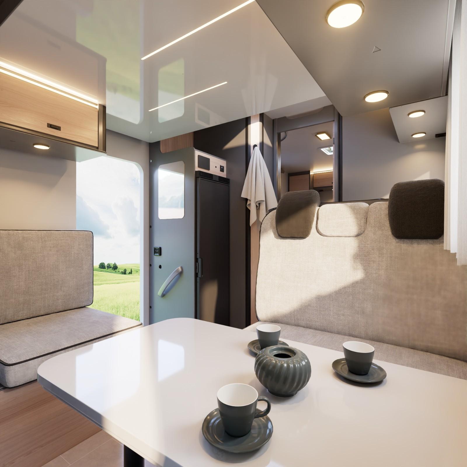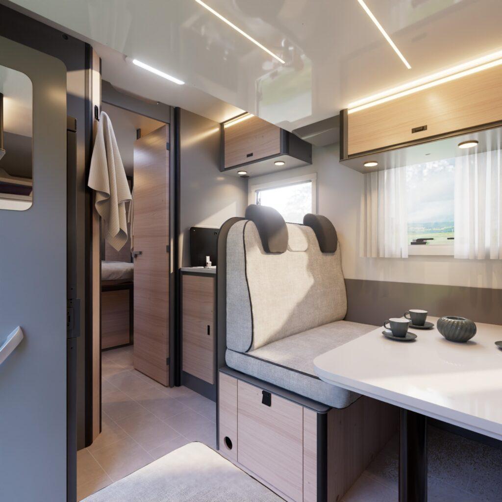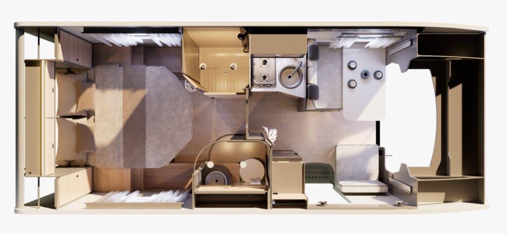 Disons-le d’emblée, ce modèle n’est pas à proprement parler une nouveauté car il reprend l’agencement intérieur du Kilig 69 Plus. Un plan sans compromis, adapté aux familles avec ses 5 places carte grise, qui conjugue la disposition de chambre préférée des Français (lit central) à une dînette classique et une douche indépendante du cabinet de toilette.