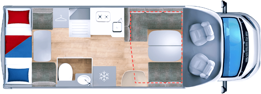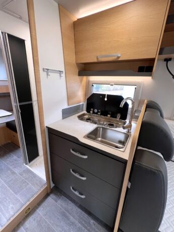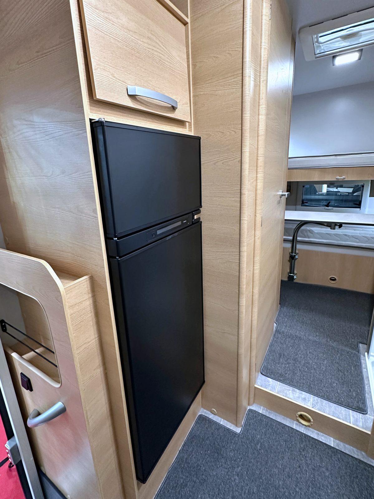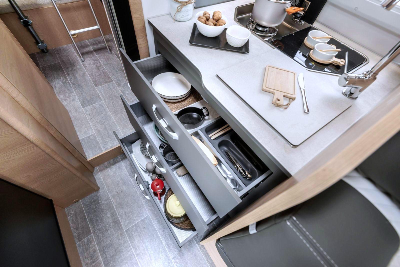 Accolée à la salle de bain, le partie centrale accueille également une cuisine. Bien proportionnée elle compte un réchaud 2 feux, un large plan de travail, un profond lavabo en Inox et trois larges tiroirs. Placard, porte-épices, patères réglables et large baie, complètent le poste. Côté porte-cellule, on retrouve une colonne qui héberge le frigo de 156 L avec partie freezer, des rangements dont un placard en partie supérieure. A noter que la porte du cabinet de toilette peut se fermer vers l’intérieur pour séparer les espaces arrière (chambre/salle de bains) et avant (cuisine/salon).