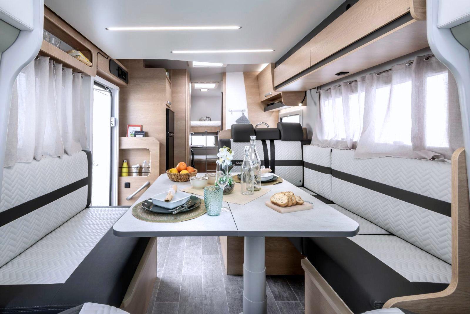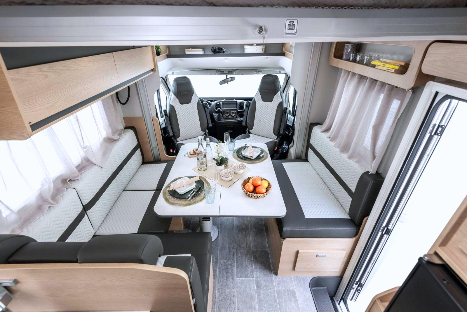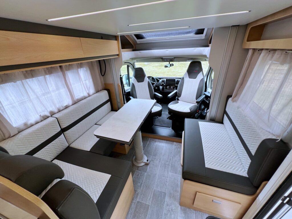 Les équipes italiennes ont procédé à un travail de fond pour adapter l’implantation d’un intégral dans le profilé Siena 396. Le résultat est à la hauteur, lorsque l’on foule le sol du vaste salon pourvu d’immenses banquettes : en L côté droit surmontées d’une large baie panoramique, et longitudinale côté droit. La grande table portefeuille centrale (110 x 94 cm) ainsi que le skyview au-dessus de la cabine, renforcent l’impression d’espace de l’habitacle qui n’a effectivement rien à envier à celui d’un intégral. D’autant qu’un lit escamotable est bien présent au plafond, sans altérer le volume à vivre.