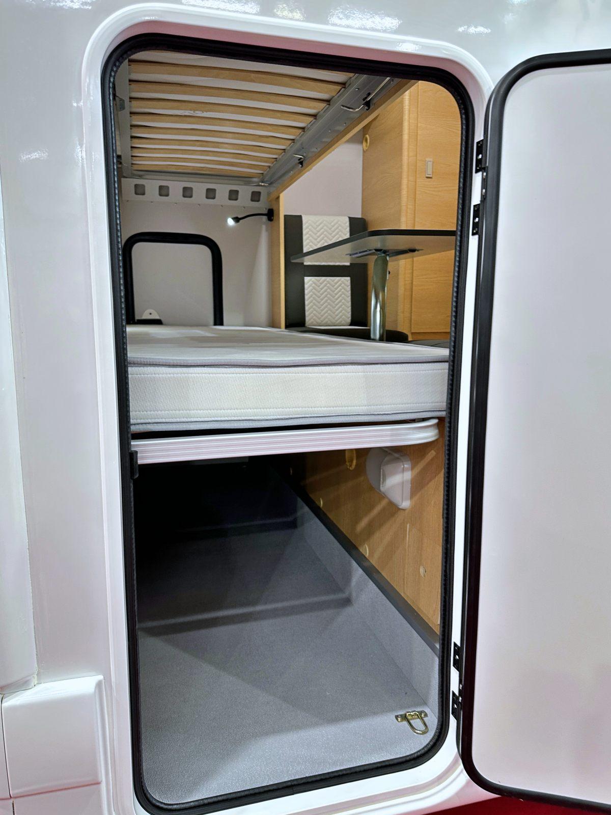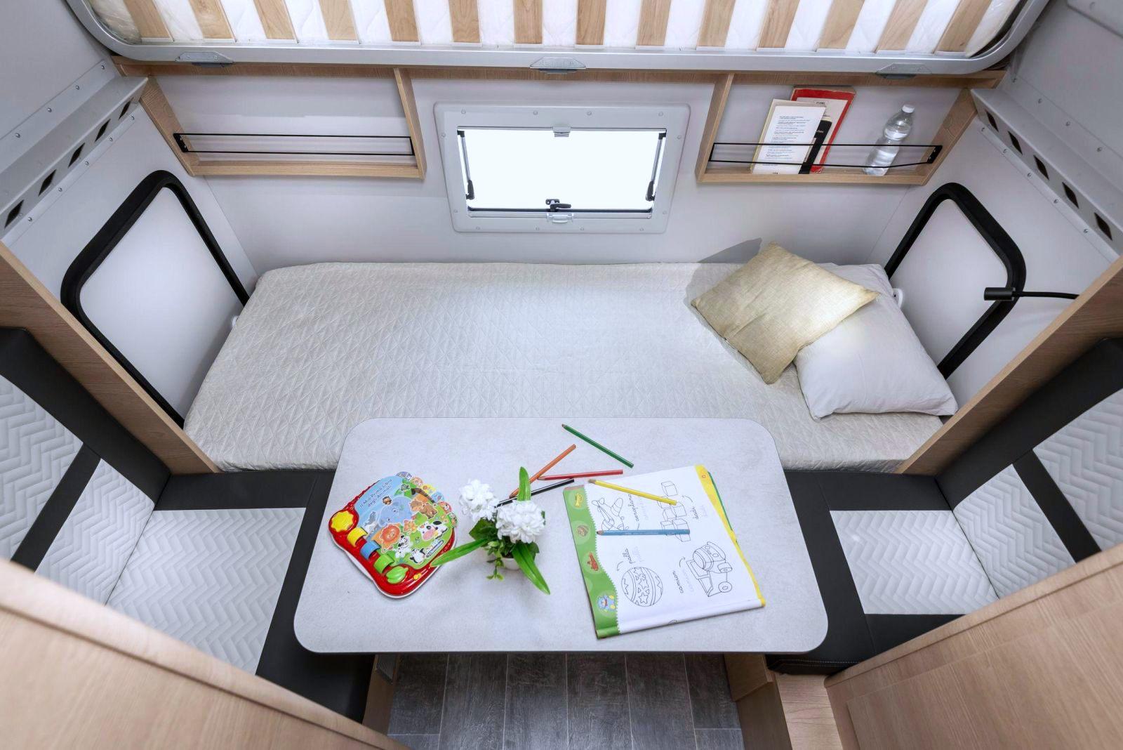 Côté nuit, le contrat est également rempli. Le lit de pavillon, qui se baisse et se monte électriquement, abrite 2 couchages dans le salon (189 x 143/124 cm). Les lits superposés arrière affichent chacun 210 x 78 cm, aptes à héberger 2 personnes supplémentaires, enfants comme adultes. Enfin un 5ème convive pourra dormir à l’avant, dans le lit de dinette aux généreuses dimensions (220 x 103 cm), à condition de descendre le lit de pavillon seulement à mi-hauteur.