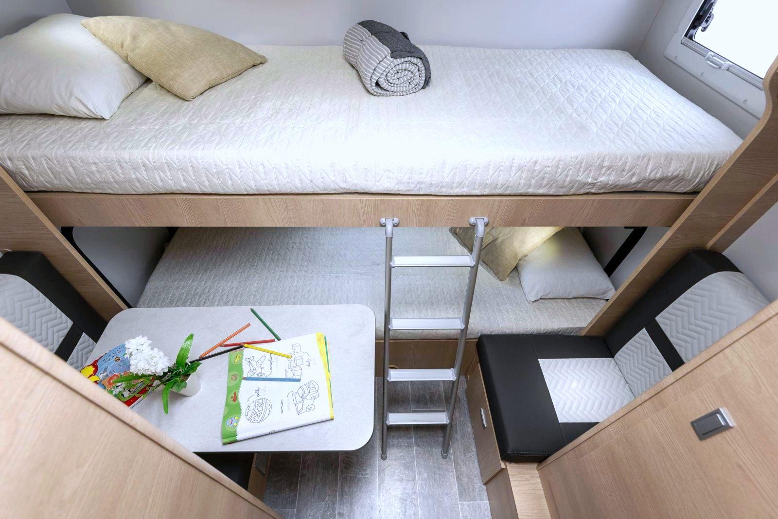 A l’arrière, pas de lit central, ni de lits jumeaux. Le profilé Siena 396 dévoile une chambre au format compact qui recèle deux lits superposés transversaux. Cet espace, idéal pour des enfants, profite d’un petit salon. Jouxtant le lit du bas, deux banquettes se font face. Une table escamotable, fixée sur un pied tubulaire pivotant, transforme l’espace en lieu récréatif pour lire, jouer, ou en dinette pour enfants. Contrairement à l’Itineo SB740, les deux petites banquettes ne se transforment pas en lit dînette pour composer un couchage deux places avec le lit inférieur. A contrario, le Siena bénéficie d’une baie arrière, absente sur l’Itineo.