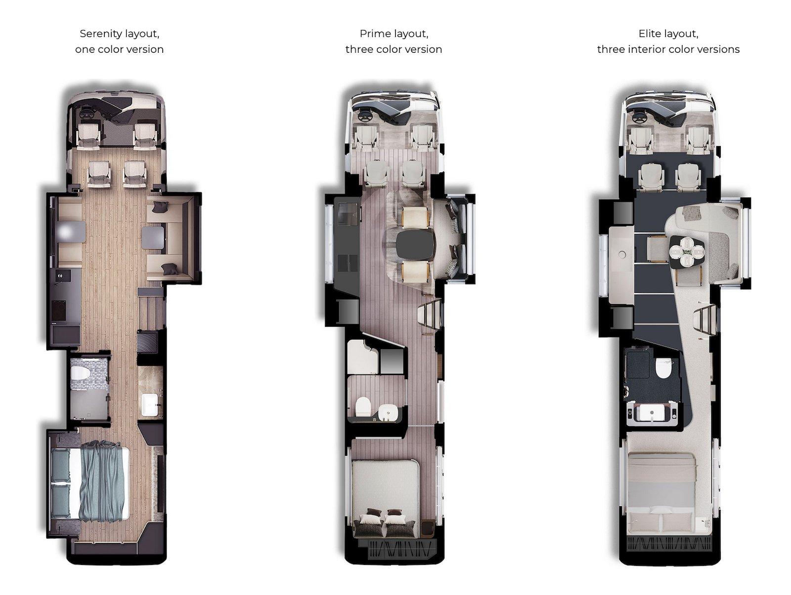 • Elite –Modèle le plus haut de gamme du catalogue, ce liner dispose d’un garage pour grande voiture jusqu’à 4 mètres de long et 1700 kg. Les montées et descentes dans le garage sont facilitées par une plateforme coulissante électrique. Dans la chambre surplombant le garage, un système breveté de mise à niveau permet d’abaisser le plancher – quand la voiture est garée à l’extérieur – pour bénéficier d’une hauteur intérieure constante de 2,05 m. Prix : à partir de 1 705 200 €.