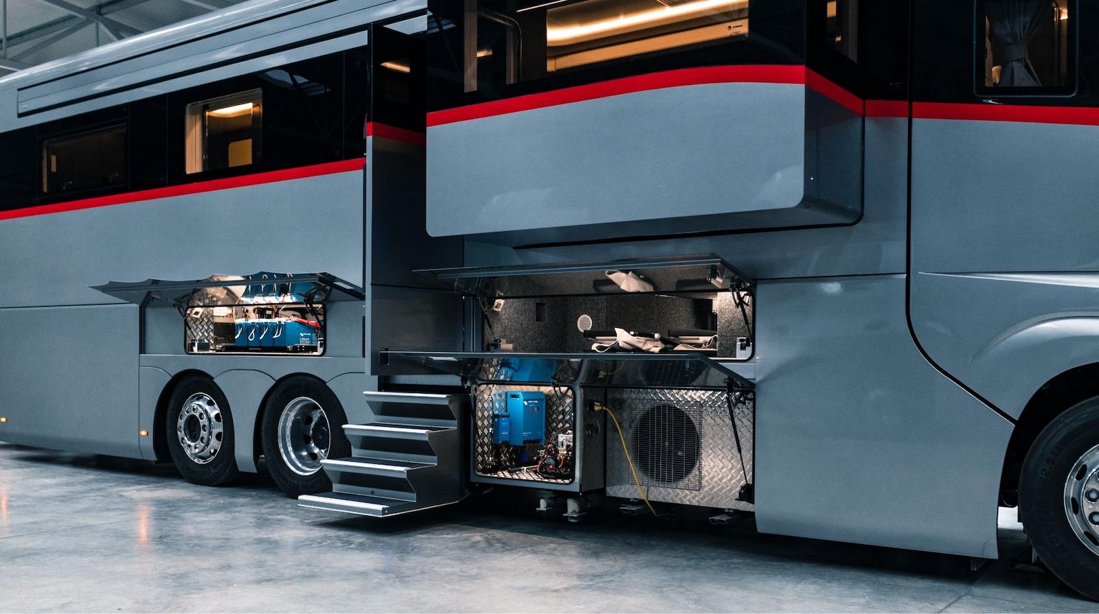 La carrosserie est conçue à partir d’épais panneaux sandwich d’aluminium (dont des panneaux latéraux gigantesques de 9,50 mètres), recouverts d’une peinture métallisée de très haute qualité Axalta. Celle-ci se compose de trois couches de peintures métallisée, de quatre couches de laque cristal anti-graffiti et en option, d’une finition nacrée métallisée. Tous les éléments d’ordinaire saillants tels que les poignées et fenêtres sont ici incorporés à fleur de carrosserie. Quant aux coffres de rangements et techniques, ainsi que le garage, ils sont parfaitement isolés, chauffés et éclairés et le verrouillage de toutes les trappes et portes extérieures est centralisée.